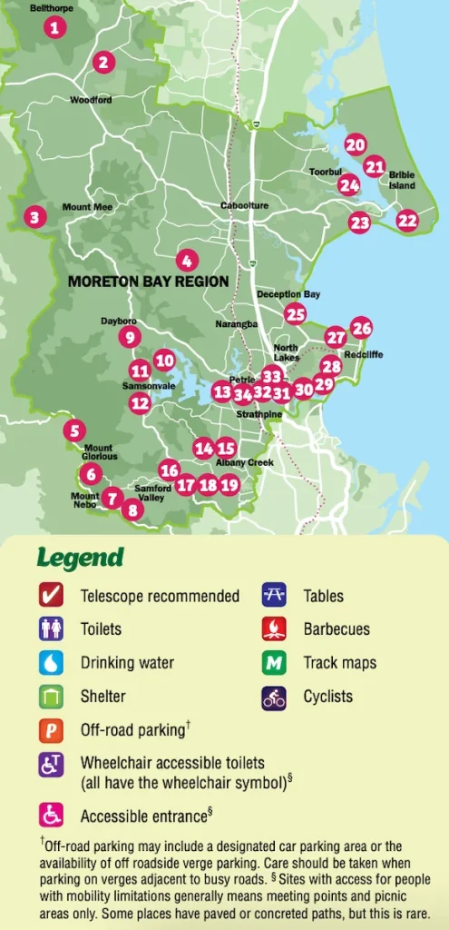 At the Osprey House Environmental Centre in Griffin, families gather on wooden decks where telescopes are positioned to point towards the water. On Bribie Island, Buckleys Hole Lagoon offers a mix of mangroves, wetlands and open foreshore, where pelicans glide low across the lagoon.