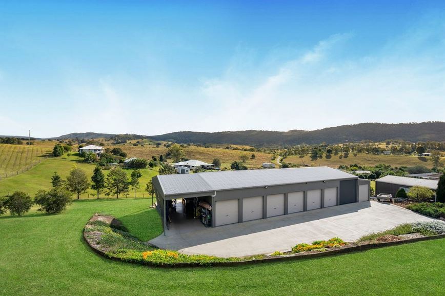 Shed Heaven: A standout 9-bay powered shed features epoxy flooring, Crimsafe window security, and full lock-up capability, perfect for car collectors, hobbyists, trades or commercial ventures, with ample room for a caravan.