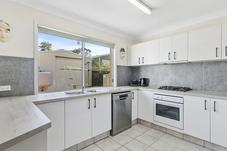 Kitchen with 4-burner gas cook top, built in oven, dishwasher and views to backyard and alfresco.