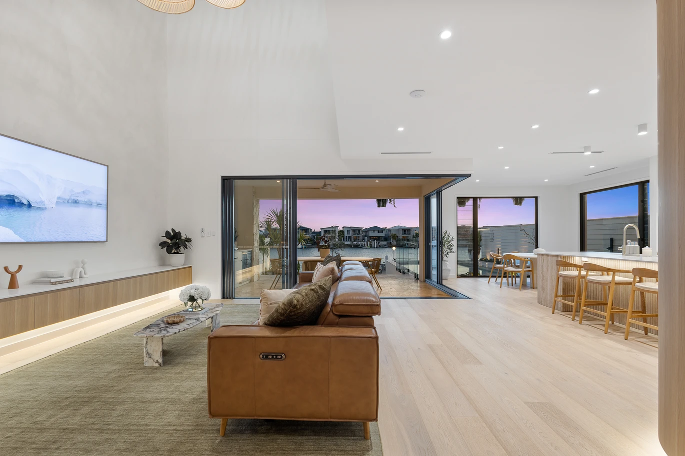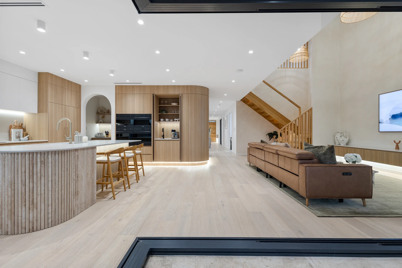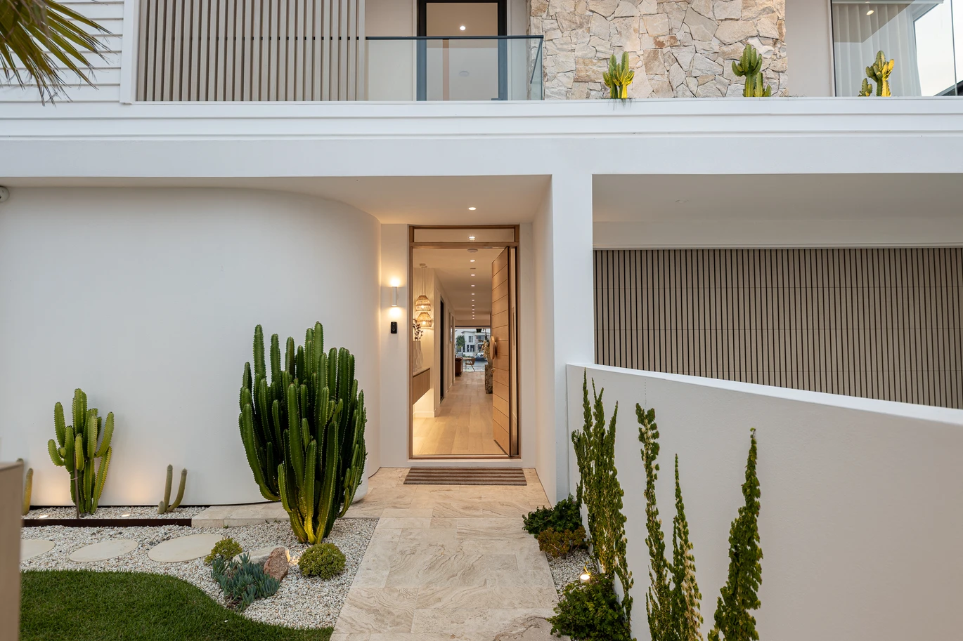 From the moment you arrive, the striking façade commands attention - custom stonework, knotwood finishes, and cascading greenery combine to create a warm yet refined welcome. Inside, the residence unfolds across two spectacular levels of designer living, with a harmonious palette of wood, white, and stone amplifying the home's connection to its waterfront setting.