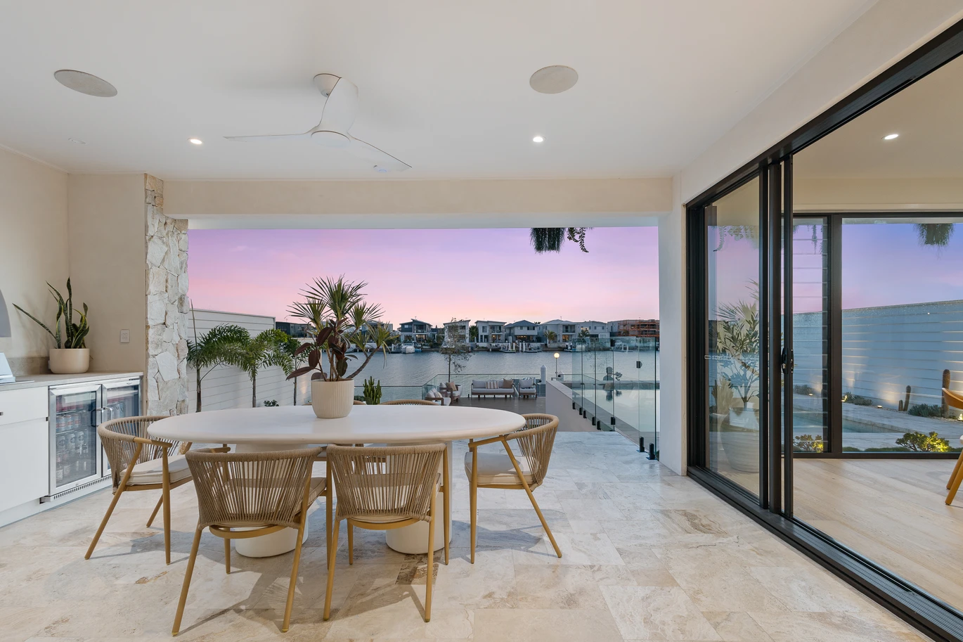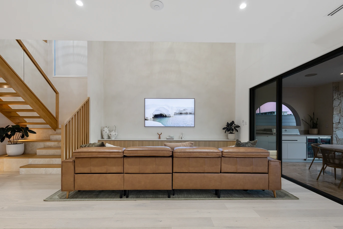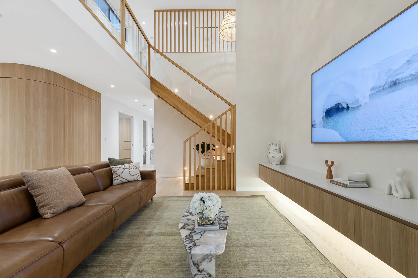 From the moment you arrive, the striking façade commands attention - custom stonework, knotwood finishes, and cascading greenery combine to create a warm yet refined welcome. Inside, the residence unfolds across two spectacular levels of designer living, with a harmonious palette of wood, white, and stone amplifying the home's connection to its waterfront setting.