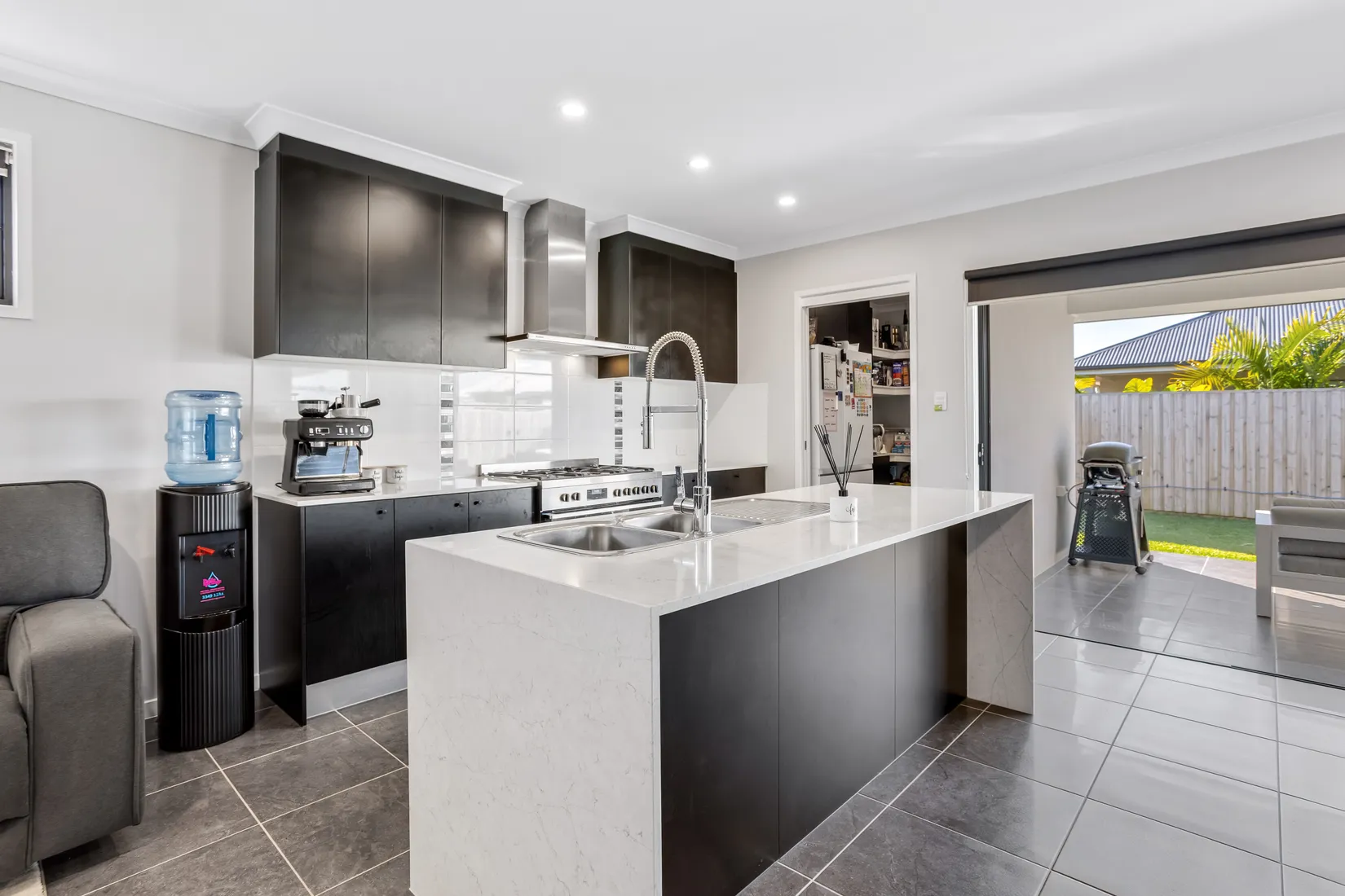 🍽️ Stylish kitchen with stone benchtops, island breakfast bar & walk-in pantry 🛋️ Expansive open plan living and dining area with split-system air conditioning