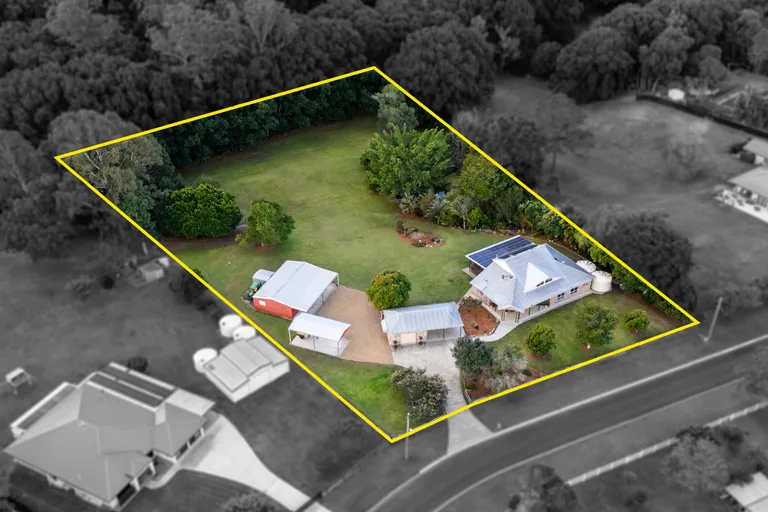 Internally, this two-storey residence has been masterfully planned for both family living and private indulgence. The lower level forms the heart of the home, featuring a modern kitchen complete with 20mm stone benchtops, a walk-in pantry, and quality Bosch appliances, all centered around a feature bay window with an amazing view. This space flows effortlessly into a choice of living areas, including a cozy lounge with a raked ceiling and wood burner. Three spacious bedrooms, a dedicated office, and a well-appointed family bathroom complete the ground floor. Ascend to the upper level to discover the exclusive master retreat-an expansive private sanctuary boasting a luxurious ensuite with a hardwood vanity, a vast walk-in robe, and a stunning private living area with vaulted ceilings and a feature bar niche, all offering an unmatched outlook over the serene landscape. The external features of this property are just as impressive, creating an entertainer's paradise and a self-sufficient haven. An enormous hardwood deck, complete with downlights and privacy blinds, provides the ultimate alfresco space for living, dining, and cooking while overlooking the sprawling grounds and the adjoining nature reserve. Enjoy direct access to Wararba Creek, a private dam surrounded by a rainforest garden, and a productive chicken coop. The infrastructure is second to none, with a 16kW battery-compliant solar power system, 44,000L of filtered tank water, a 12m x 7.5m triple bay shed with a workshop, plus a high-roof caravan hardstand, ensuring every practical need is met with absolute quality.