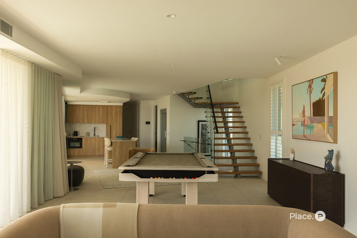 On the mid level, the ultimate entertainer’s domain awaits featuring a generous retreat, games room, and a designer kitchenette and bar finished in exquisite Silver Travertine. Outside, every element of resort-style living has been considered. A sparkling mineral pool takes centre stage amid lush landscaping, complemented by a poolside deck, outdoor shower, and a Vergola-covered alfresco zone designed for year-round enjoyment with a backdrop on ocean vistas.