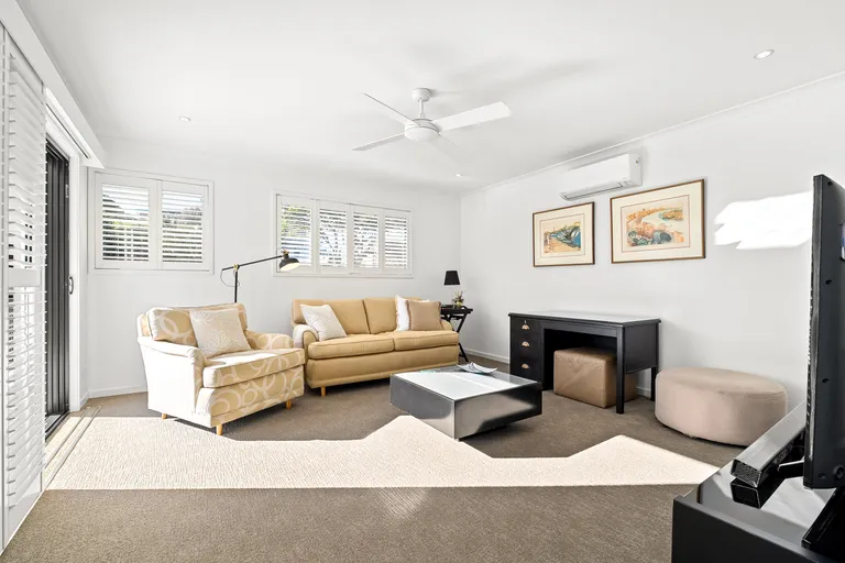 The master bedroom is a true retreat, offering remote-control blinds, plush carpets, and stunning views across the Croquet Club to the water, the perfect way to wake up every morning. The home also offers peace of mind with CCTV security and a fully fenced yard, ideal for children and pets.