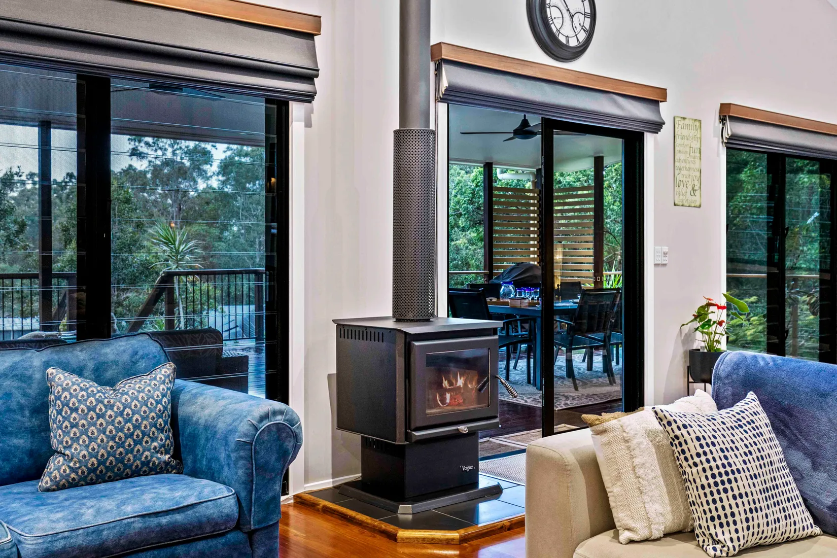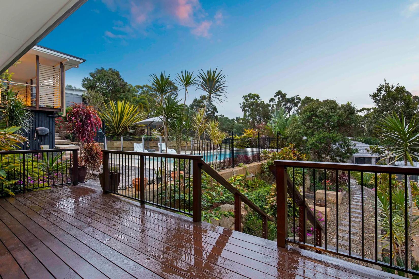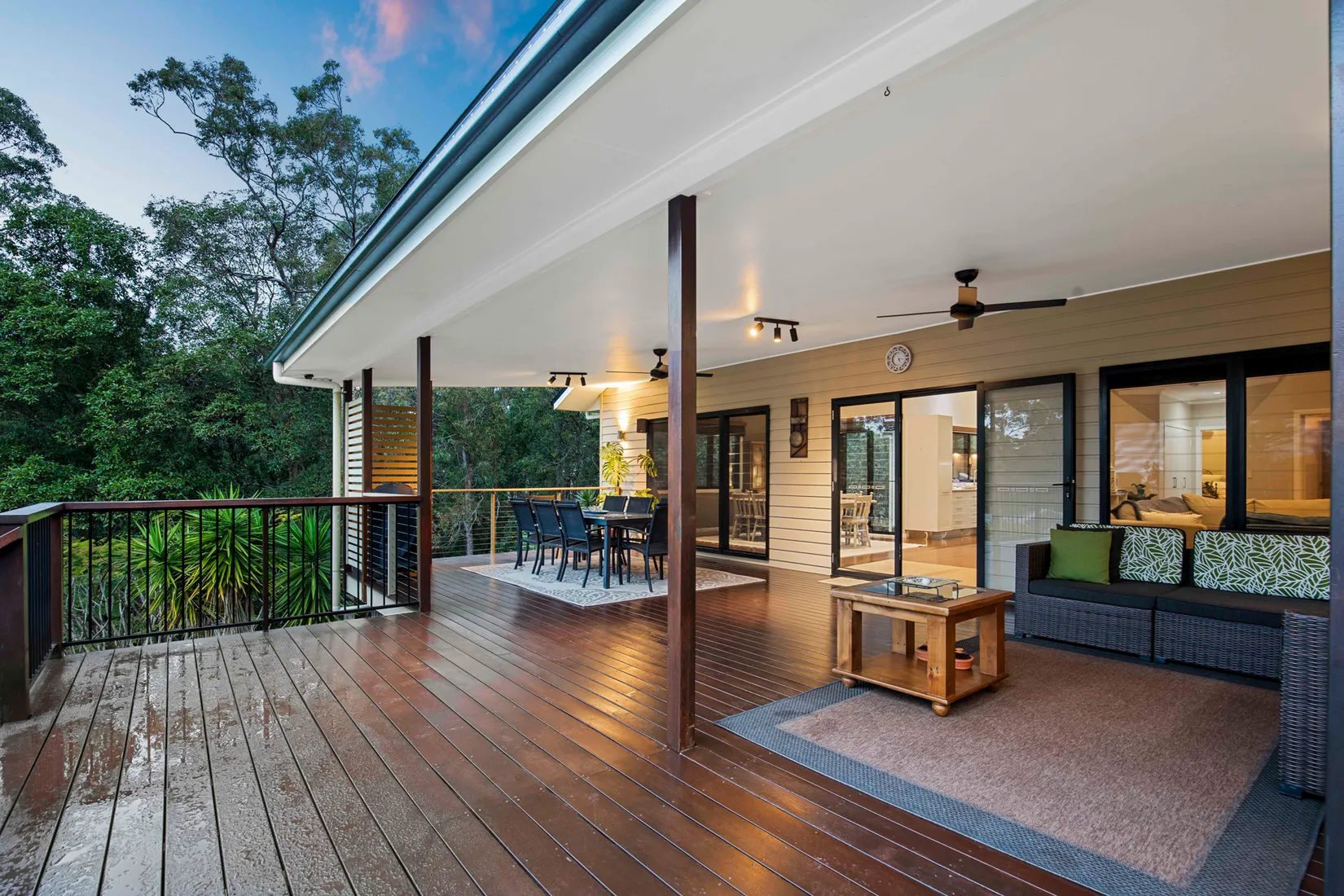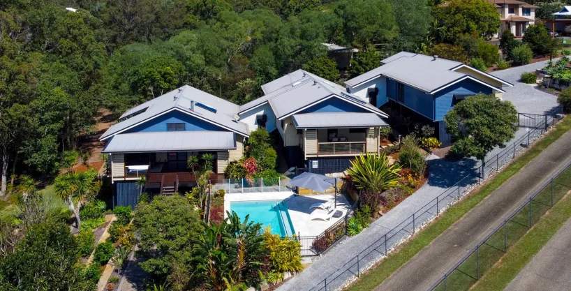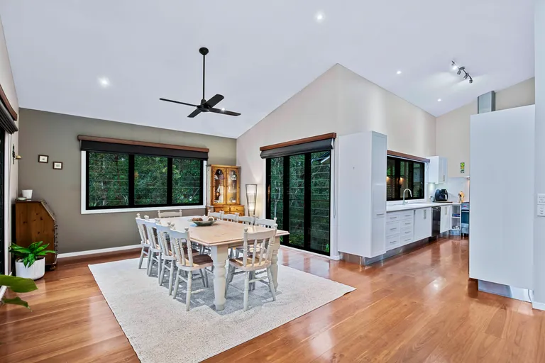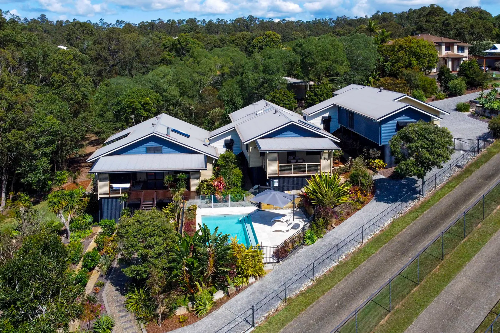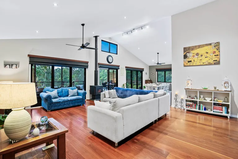 It's perfect orientation and elevation allows cooling Summer northerly breezes (or warmer Winter sun) across the decks and into all living areas and rooms, through the banks of louvered windows. Sustainability features includes solar power generation, two solar hotwater systems given the enormous size of the home, 4 large water tanks and established and easy care self-sustaining native gardens that attract the abundant birdlife!