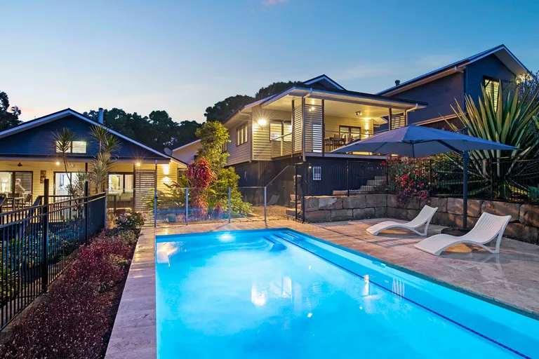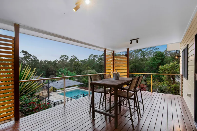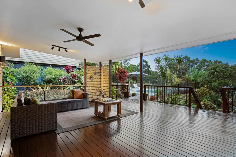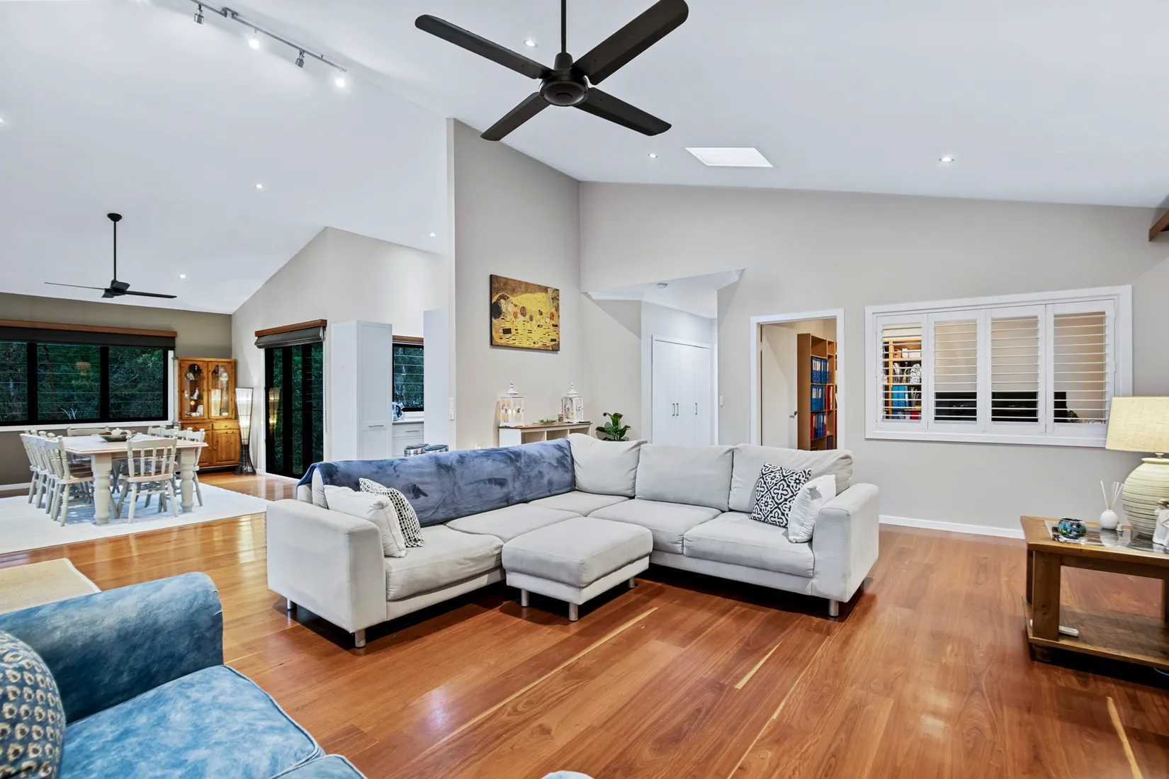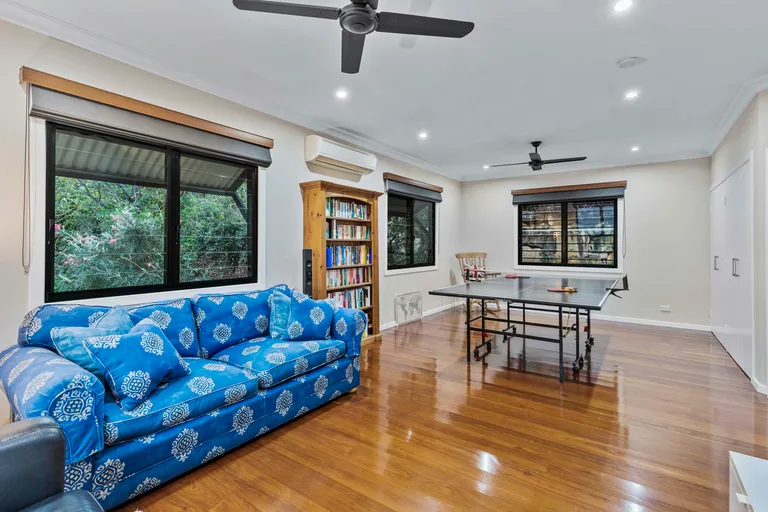 Polished timber floors flow through light filled living and dining areas, connecting seamlessly to multiple outdoor entertaining zones. Whilst overlooking the near new sparkling inground saltwater pool. Enjoy leafy surrounds, cooling breezes, and year round relaxation thanks to thoughtfully landscaped and established gardens including producing fruit trees.