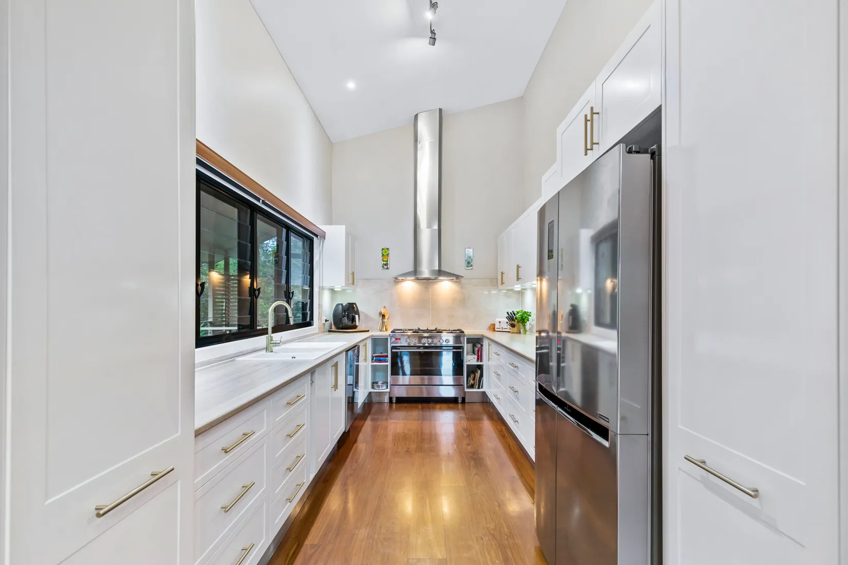 The modern kitchen forms the true heart of the home, showcasing premium 2pac cabinetry, a brand-new freestanding five burner gas stove with a 900mm oven and striking timber benchtops that add warmth and character. Thoughtfully designed for both style and practicality, it offers a large farmhouse sink positioned to capture scenic views along with cleverly appointed corner cabinetry that maximises storage and functionality.