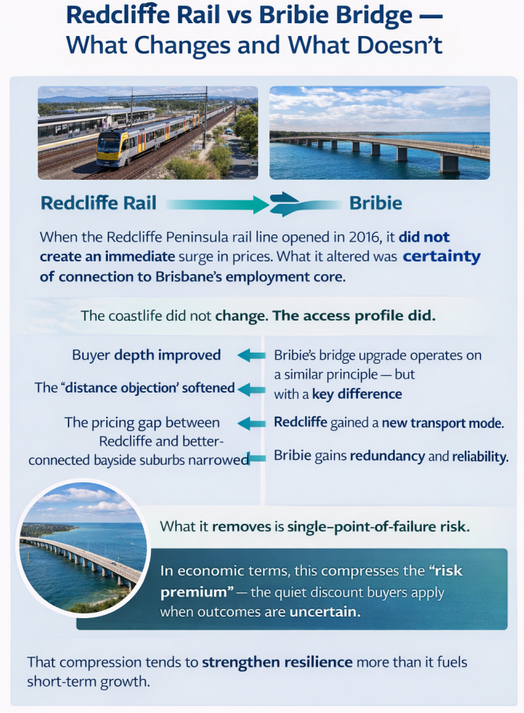 For Banksia Beach, this is not just a traffic story. It is an access and resilience story — and access influences how markets price risk.