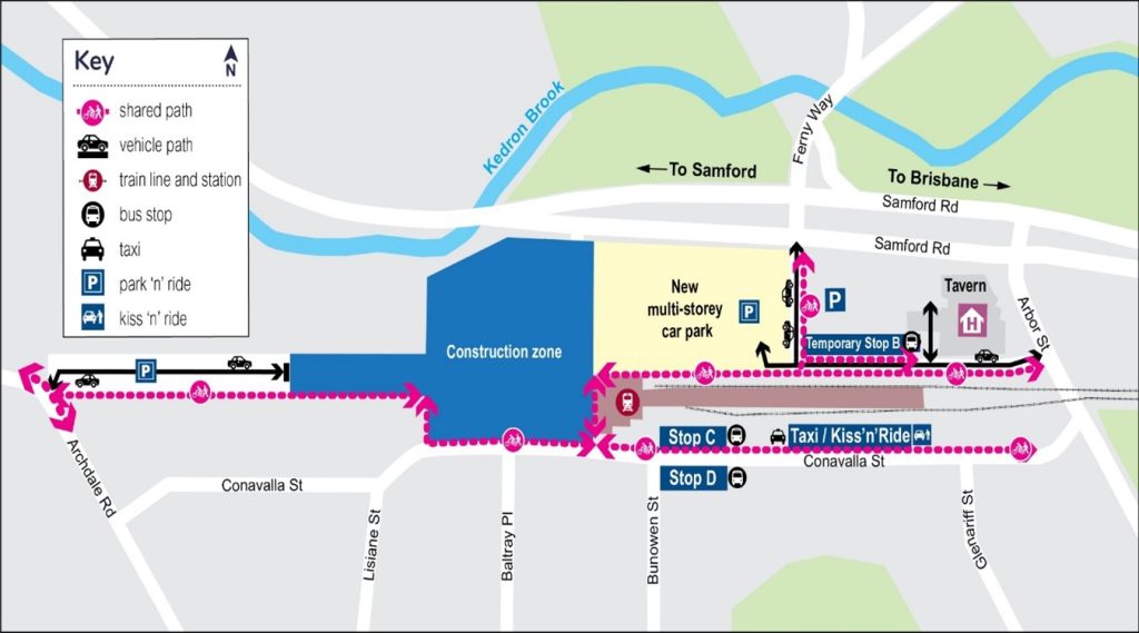 Stage 2, now under construction and tracking toward Q3–Q4 2026 completion, includes the Ferny Grove Central retail precinct, The Fernery Apartments residential development, new internal access roads, a new bus stop, upgraded kiss ‘n’ ride and new taxi ranks. Samford Road widening and culvert upgrades form part of the broader integration works.