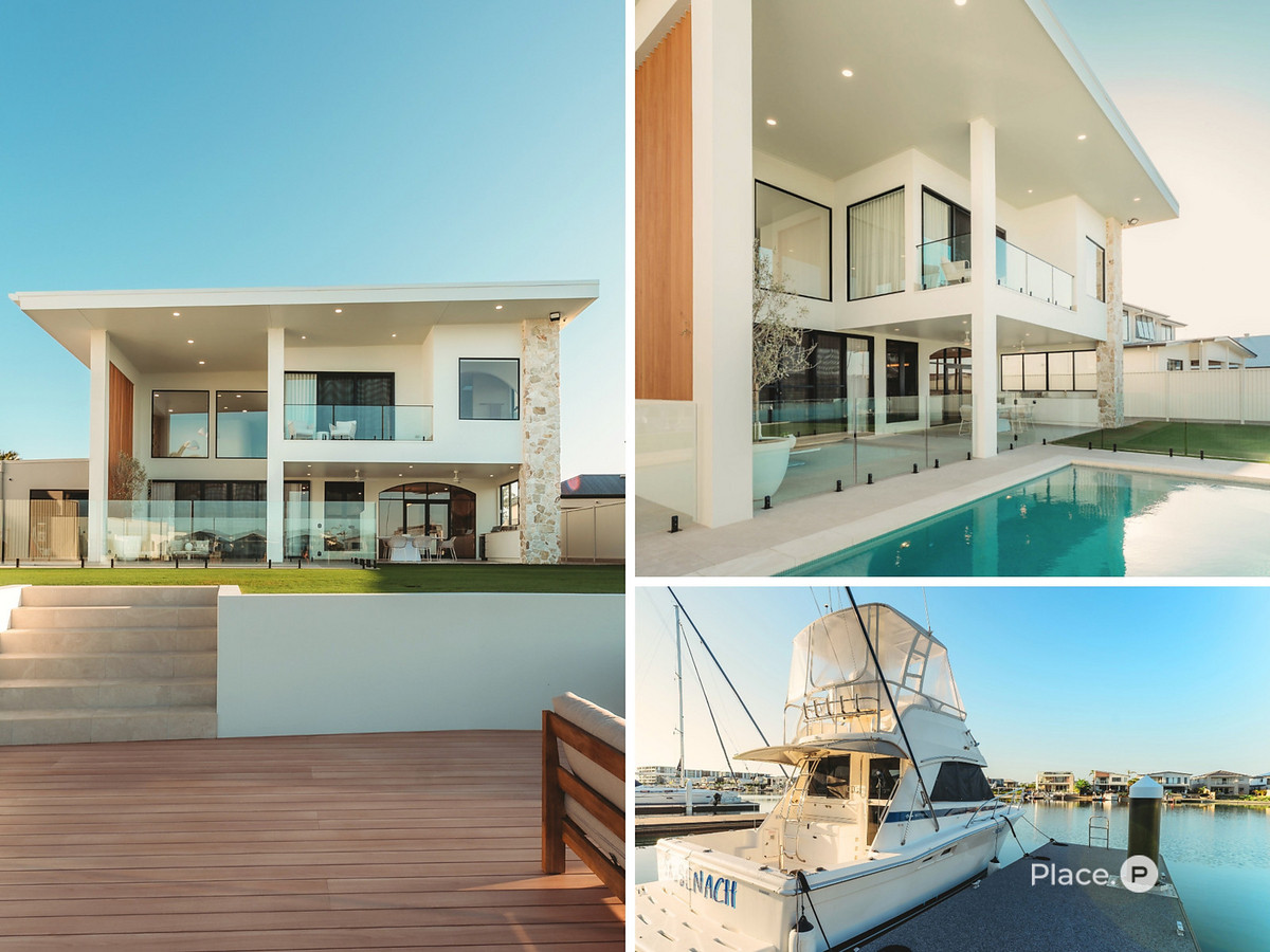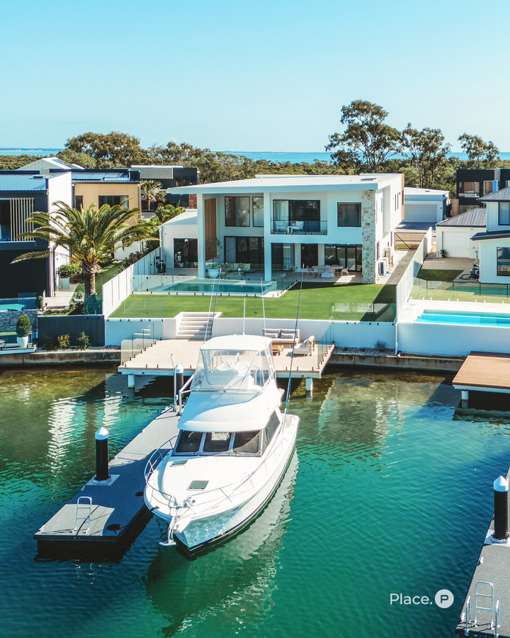 A covered alfresco with built-in BBQ and wine fridge flows to the overwater deck and saltwater pool. Beyond that, a private 12-metre pontoon places Moreton Bay within easy reach. The level grassed rear yard — almost impossible to find on the lake — offers genuine space for children, pets and gatherings.