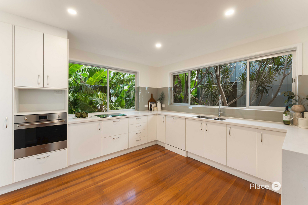 The upper level has been beautifully renovated and centres around a sleek modern kitchen featuring stone benchtops, glass splashbacks, induction cooking, stainless steel appliances and a large butler’s pantry with prep space and direct access to the yard. The generous master suite captures city views from its Juliette balcony and includes a walk-in robe and easy access to the stunningly renovated bathroom with floor-to-ceiling tiles, premium finishes and a separate toilet. Two additional oversized bedrooms with built-in wardrobes and ceiling fans complete this level. Elevated breezes, abundant natural light and city views enhance every space.