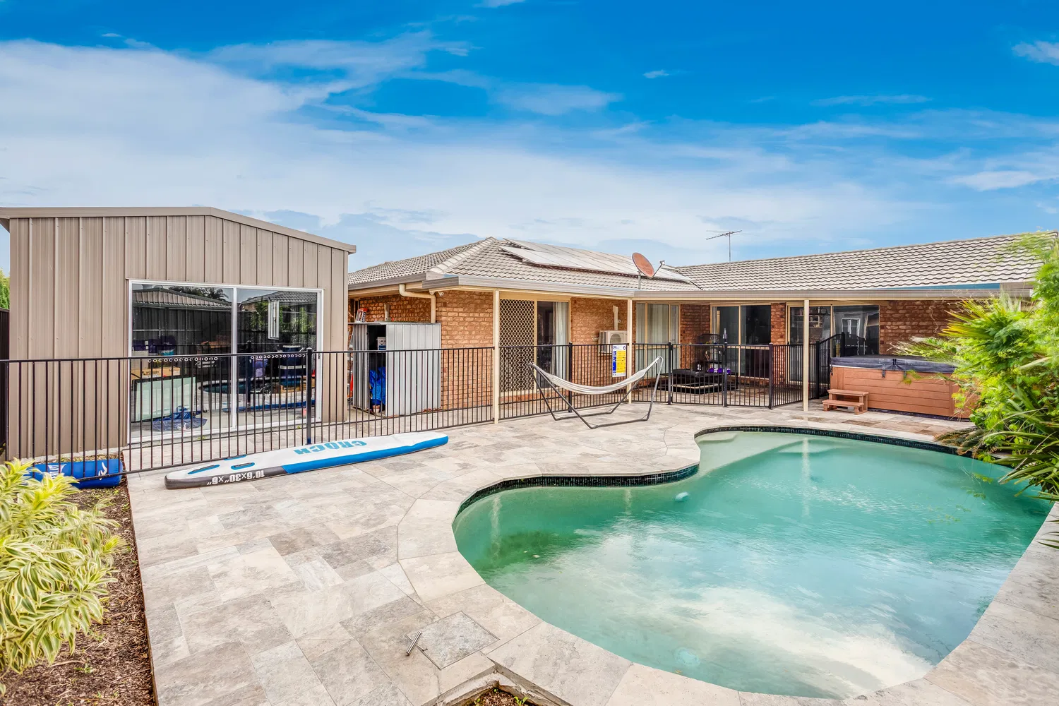 Outdoors, this home truly shines. A large, covered entertainment area overlooks the sparkling pool, offering the perfect setting for weekend gatherings, summer BBQs and relaxed family living. The 9m x 3.8m shed provides excellent storage or workspace, while the fully fenced Colourbond yard ensures privacy and low-maintenance living.