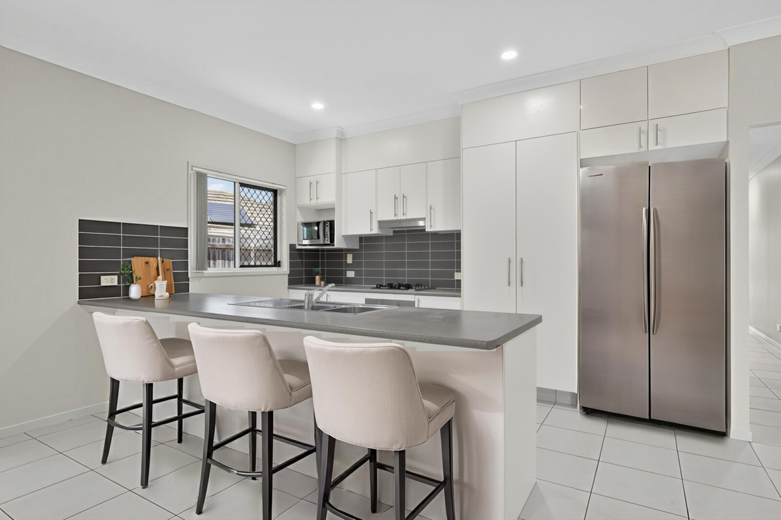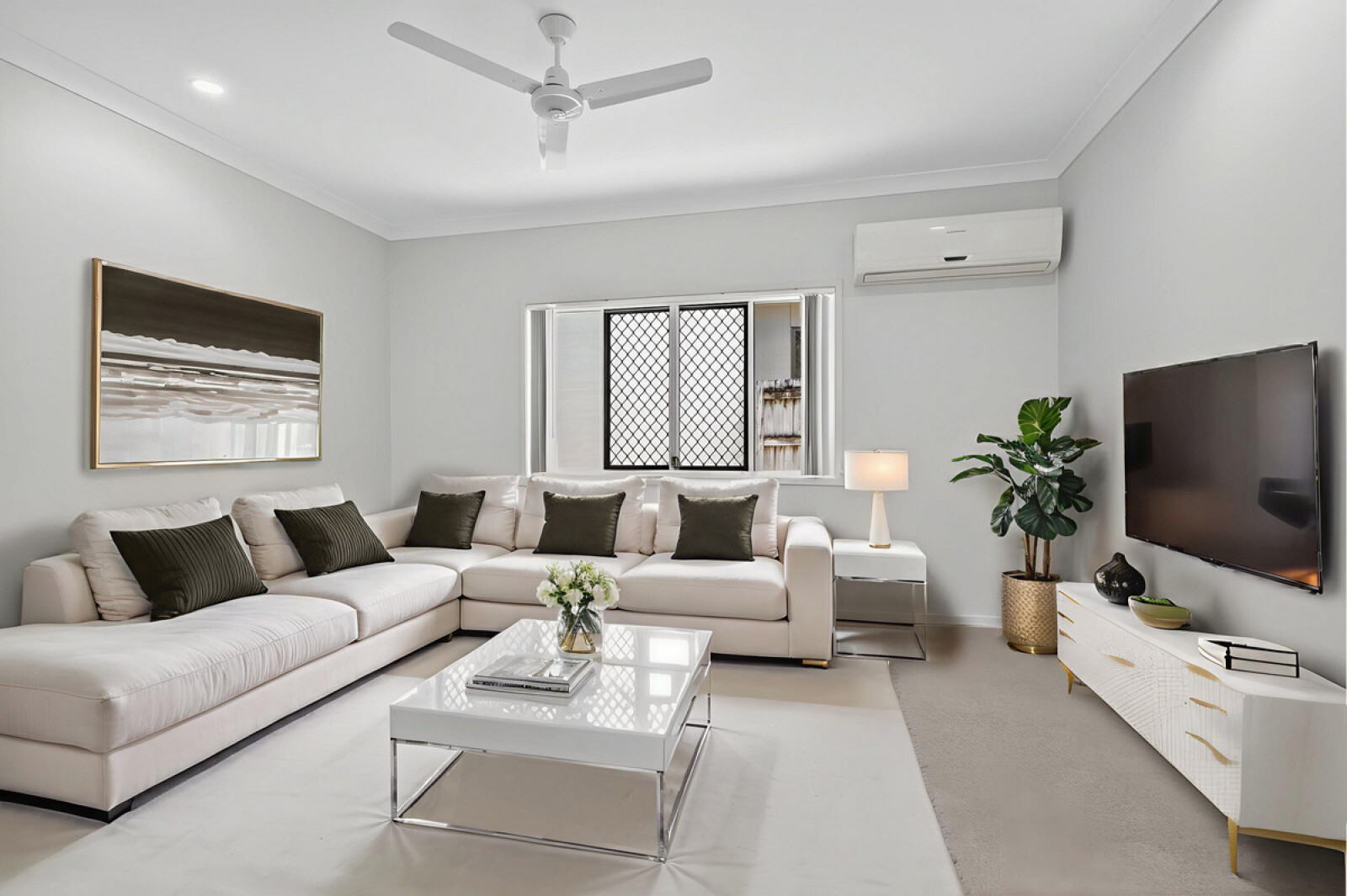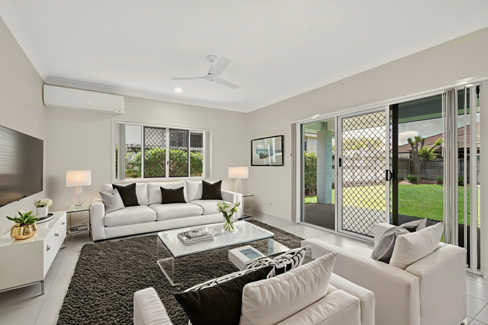 Designed with privacy in mind, the air-conditioned master bedroom is tucked at the rear of the home and includes an ensuite and wall-to-wall mirrored robes. Two additional bedrooms complete the accommodation, each with built-ins and ceiling fans.