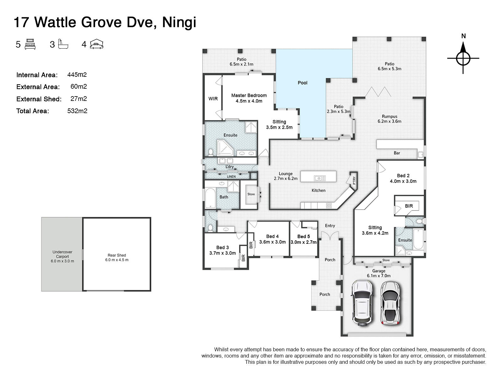 · Rear shed: 6m x 4.5m, powered, with attached carport