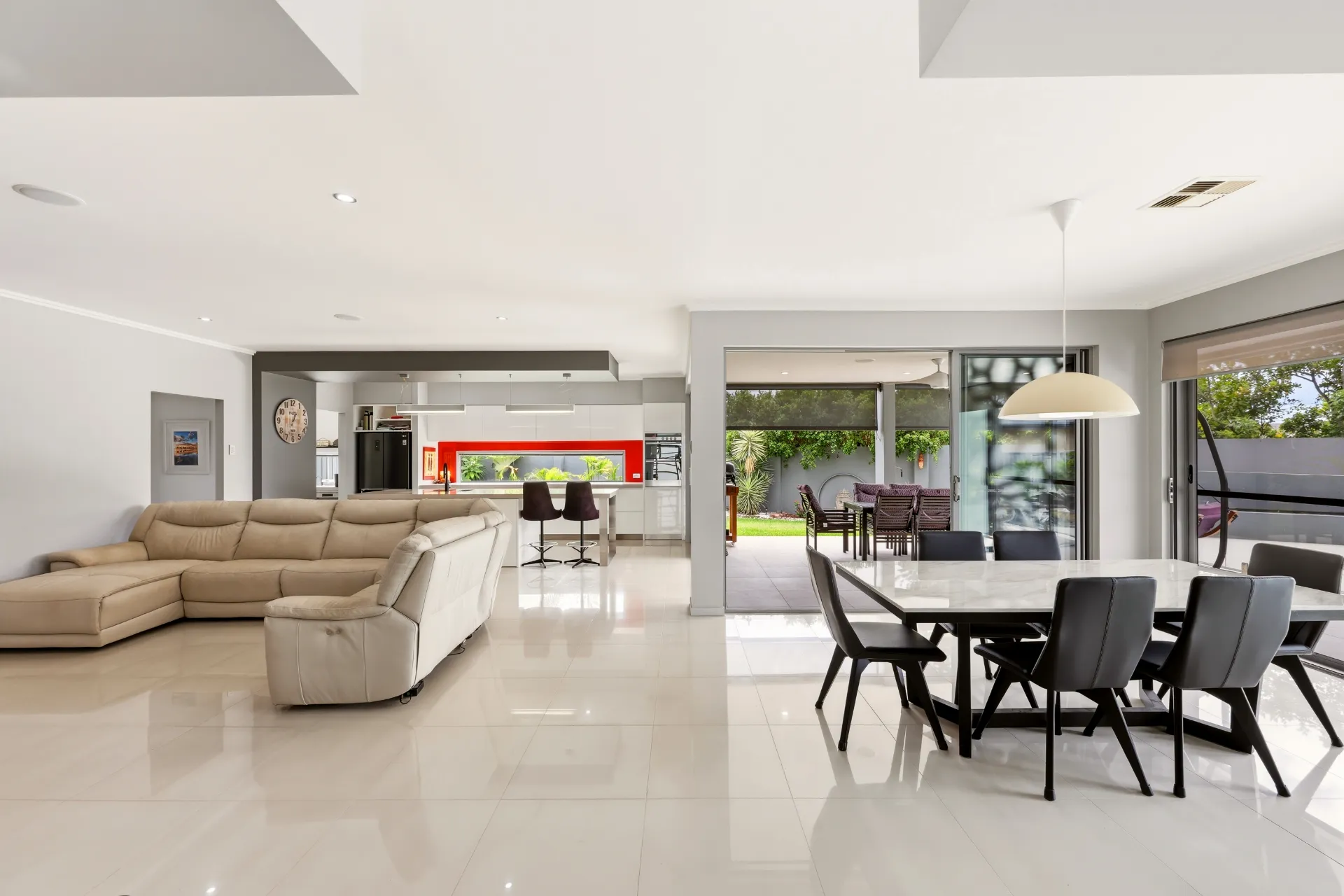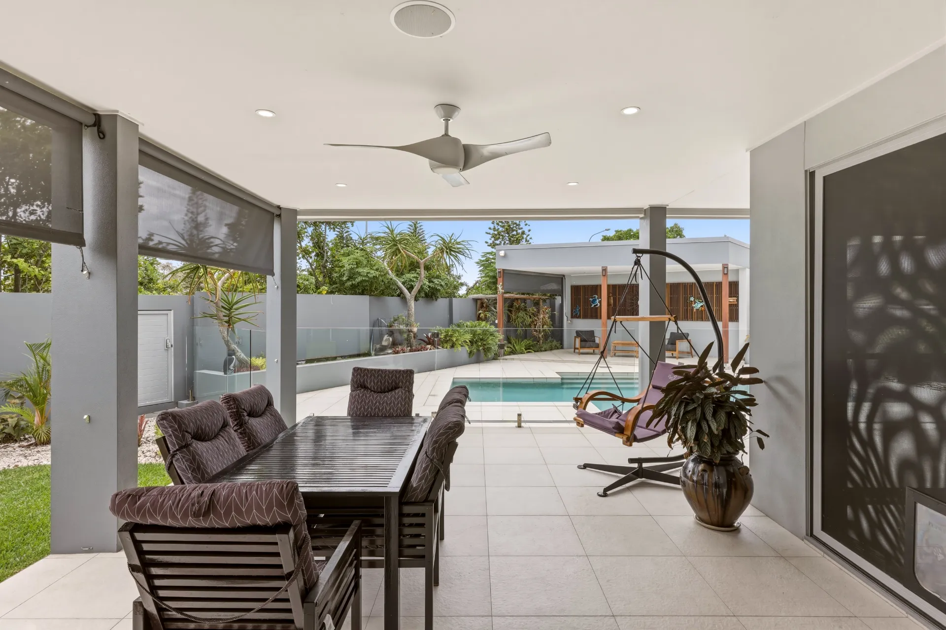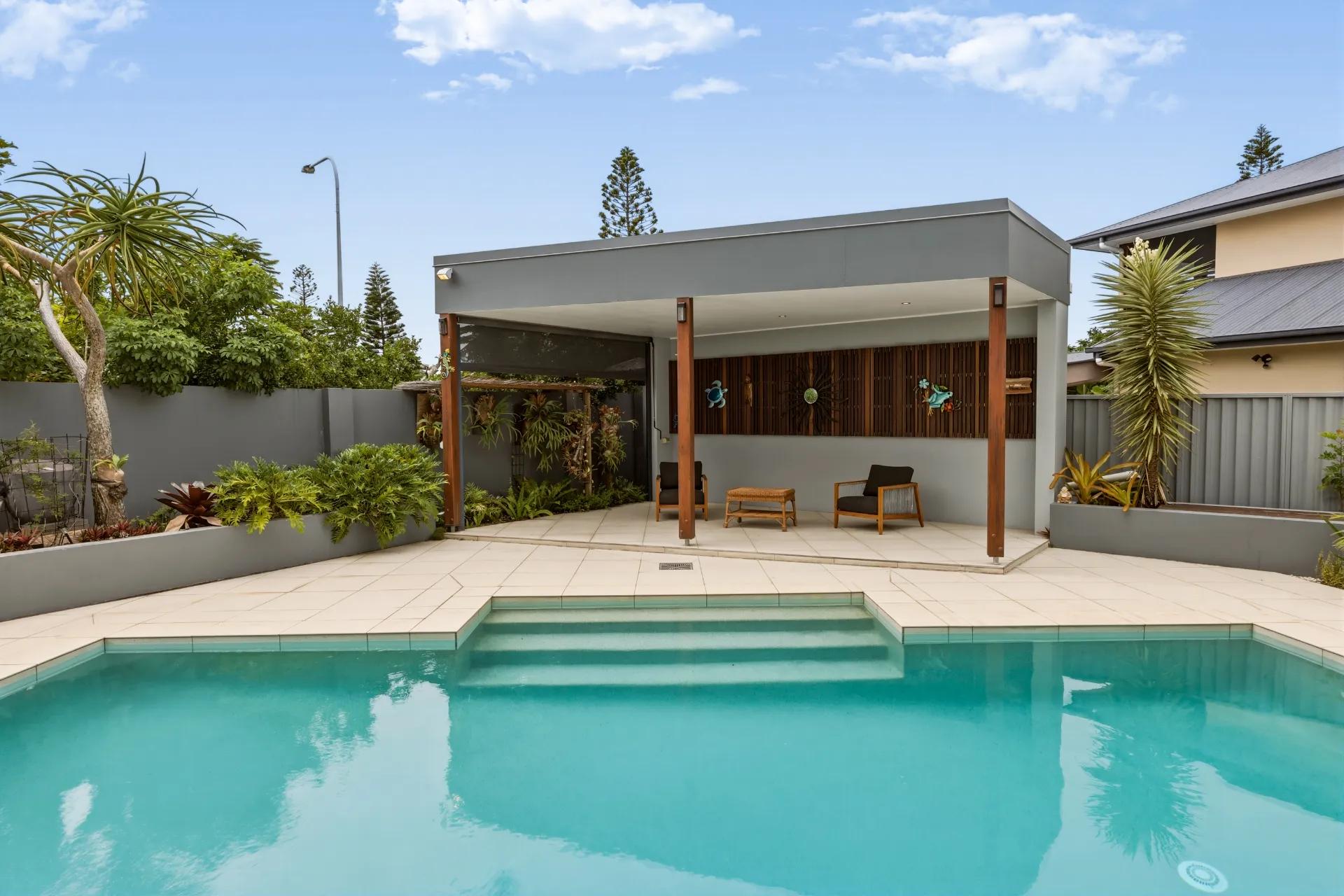 Wall-to-wall glass sliders extend the living outdoors to a spectacular covered alfresco area, perfectly equipped for year-round entertaining with tiled flooring, pull-down blinds, speakers, and ceiling fan. The resort-style backyard features a solar-heated in-ground pool, stylish cabana, and a large secure lawn where children and pets can play freely.