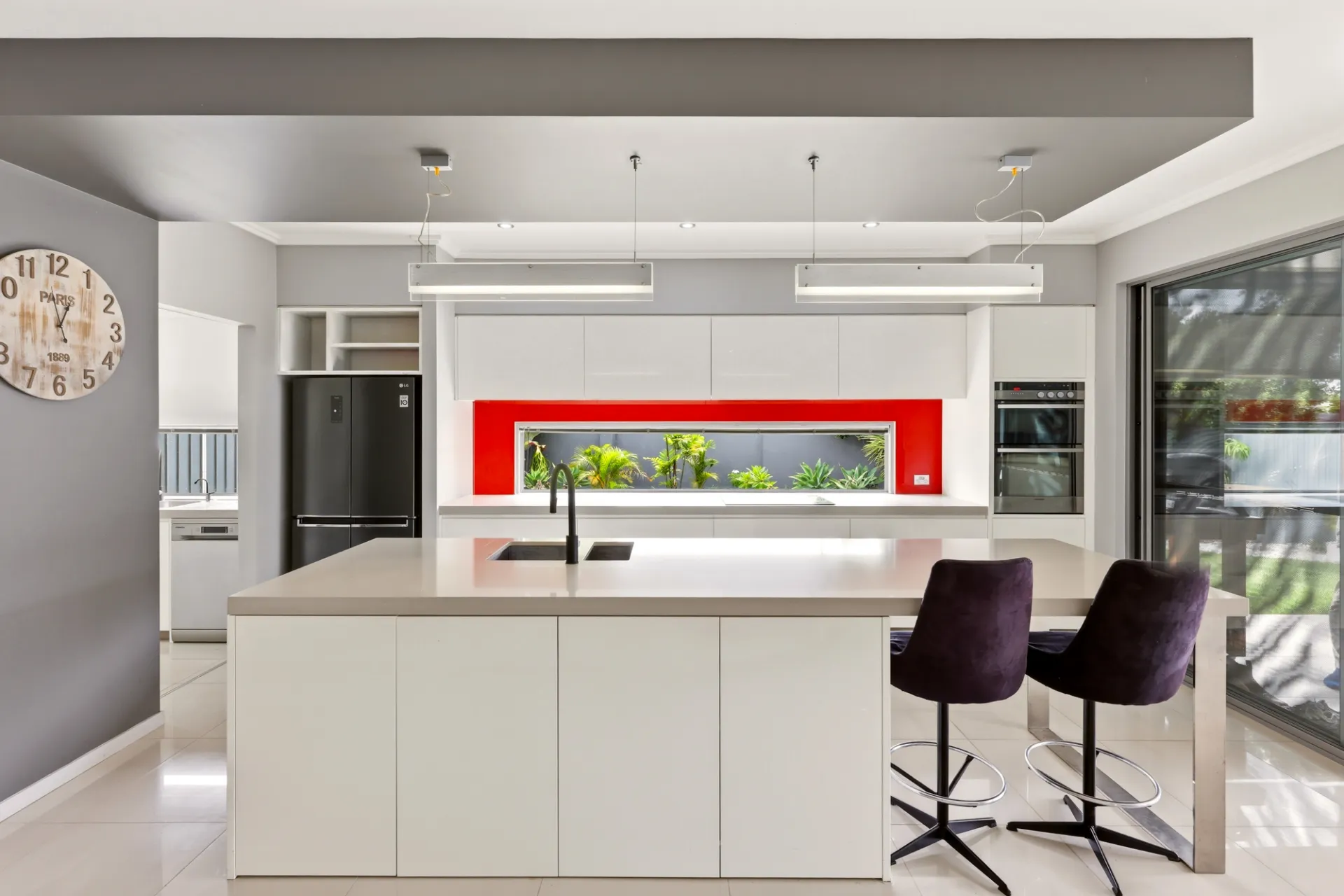 At the heart of the home, the designer kitchen impresses with its vast footprint, premium appliances, and abundant storage. A huge butler's pantry enhances practicality, while the oversized stone island with integrated dining creates a natural gathering point for family and guests alike.