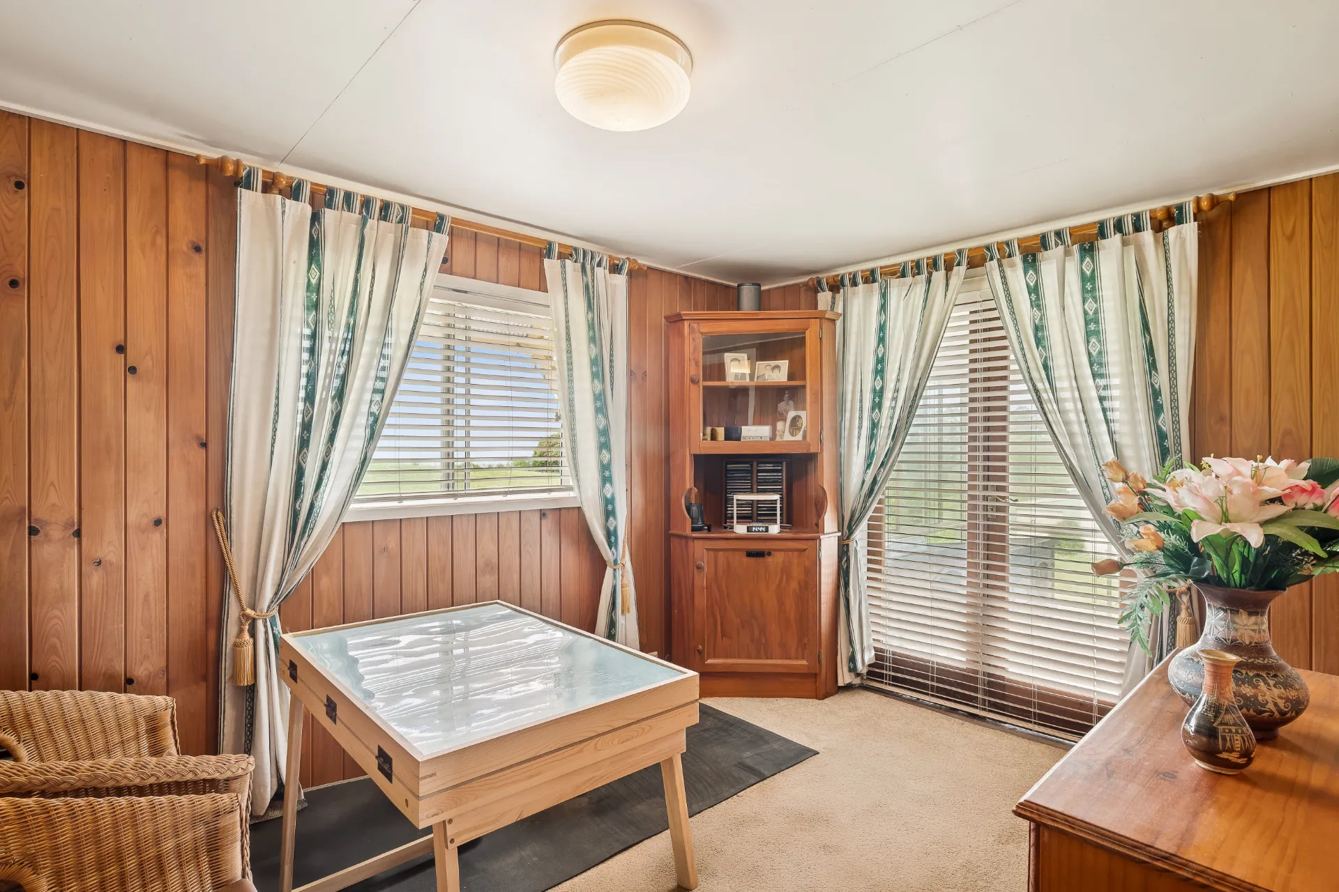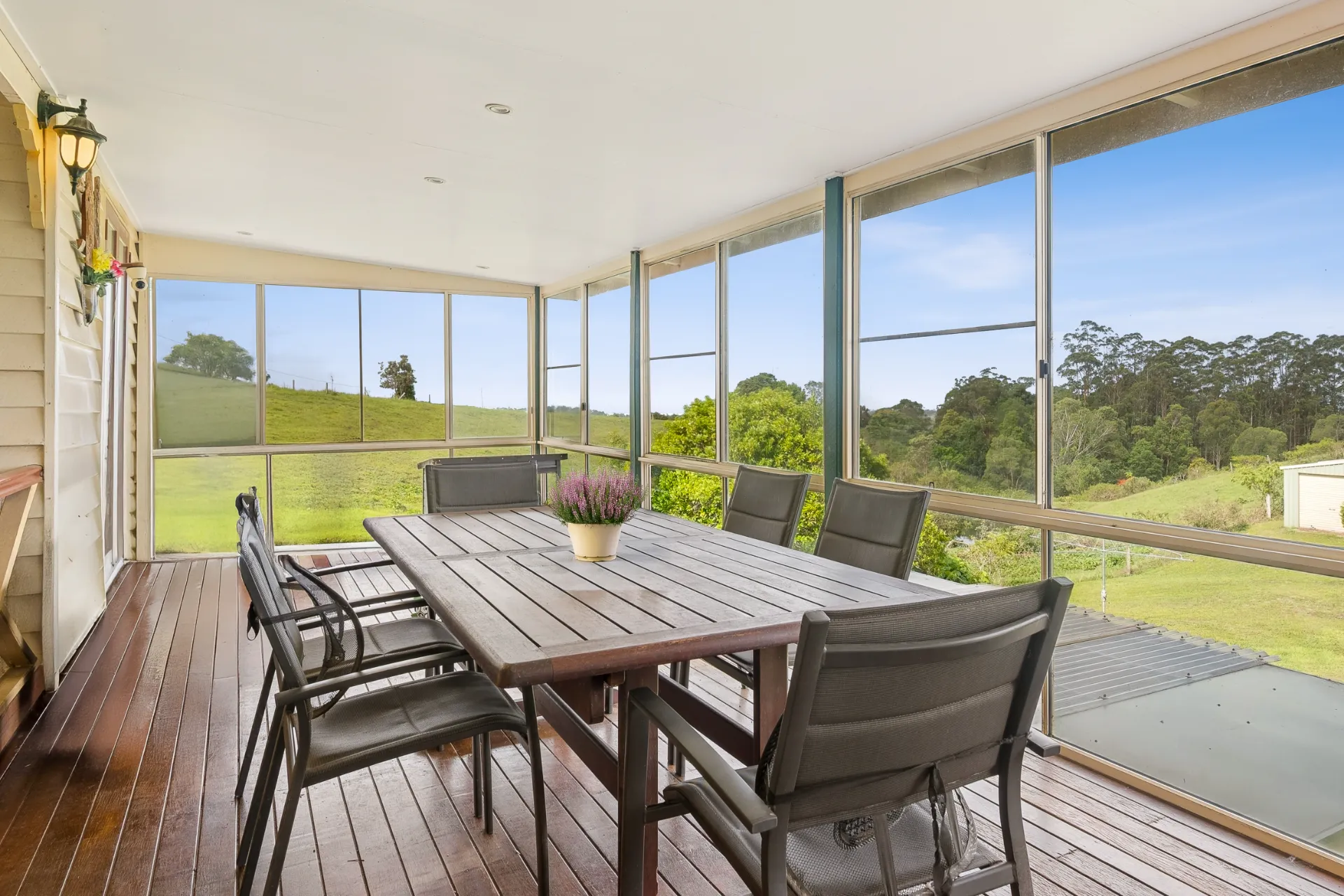 The fully enclosed timber deck is a standout, offering year-round enjoyment and breathtaking views across green pastures and out to the distant ocean. Whether you're unwinding with family or hosting long lunches, this serene vantage point captures the very essence of country living.