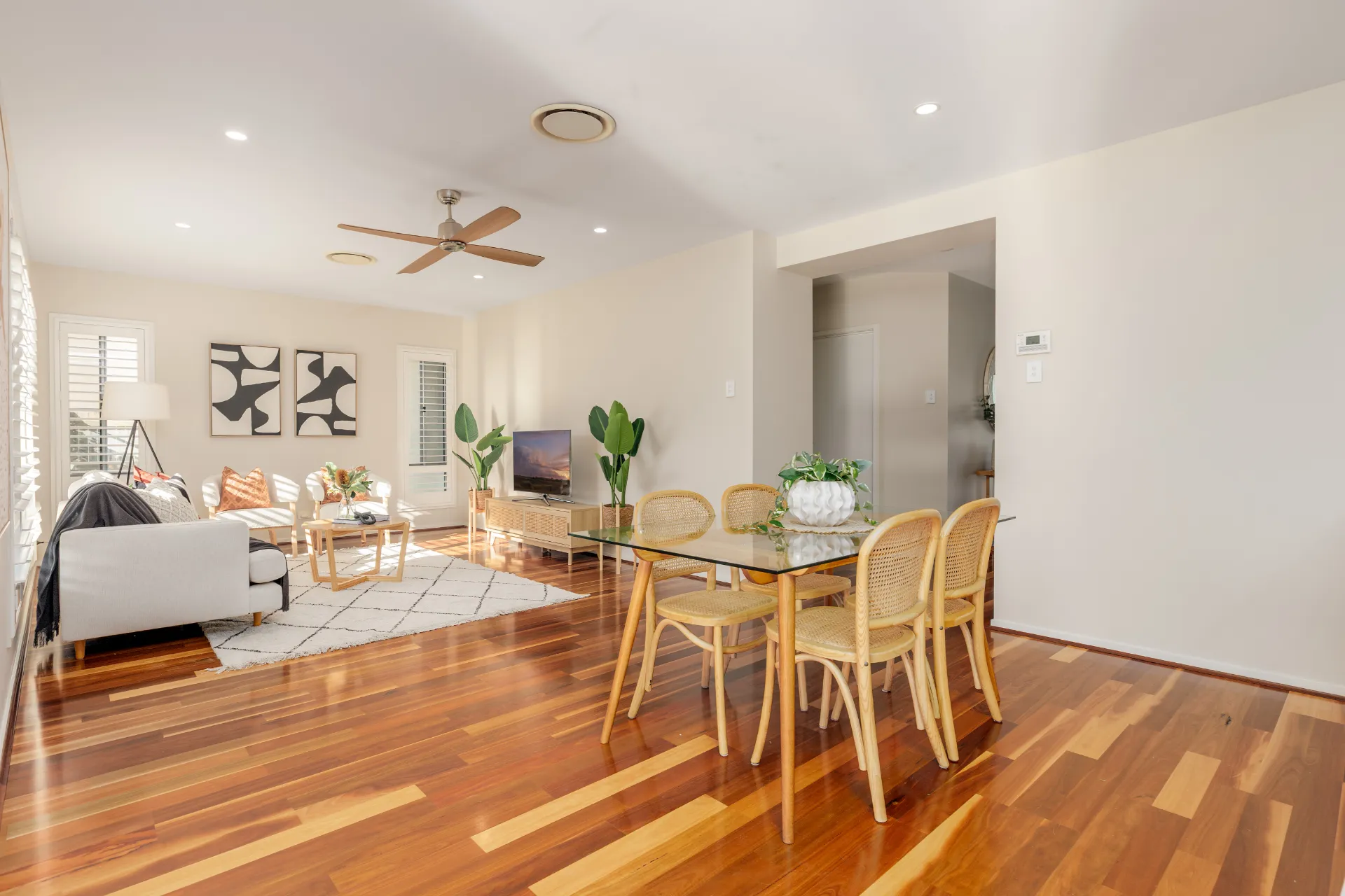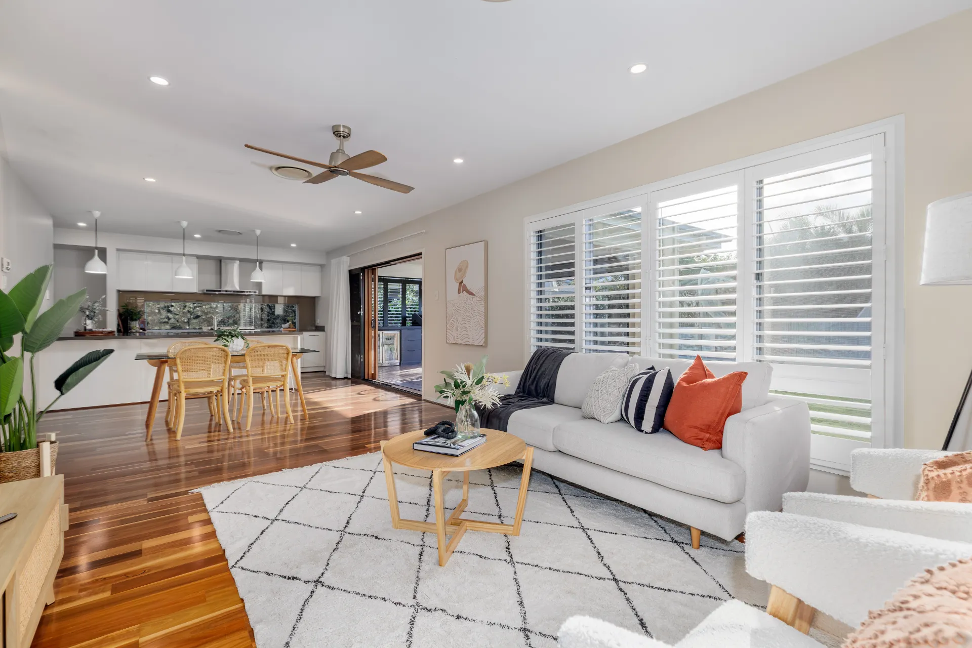 Downstairs, the main living spaces are enhanced by spotted gum engineered flooring, Daikin ducted air-conditioning (4 zones), plantation shutters throughout, and ample storge including a walk-in linen closet, and under-stair storage.