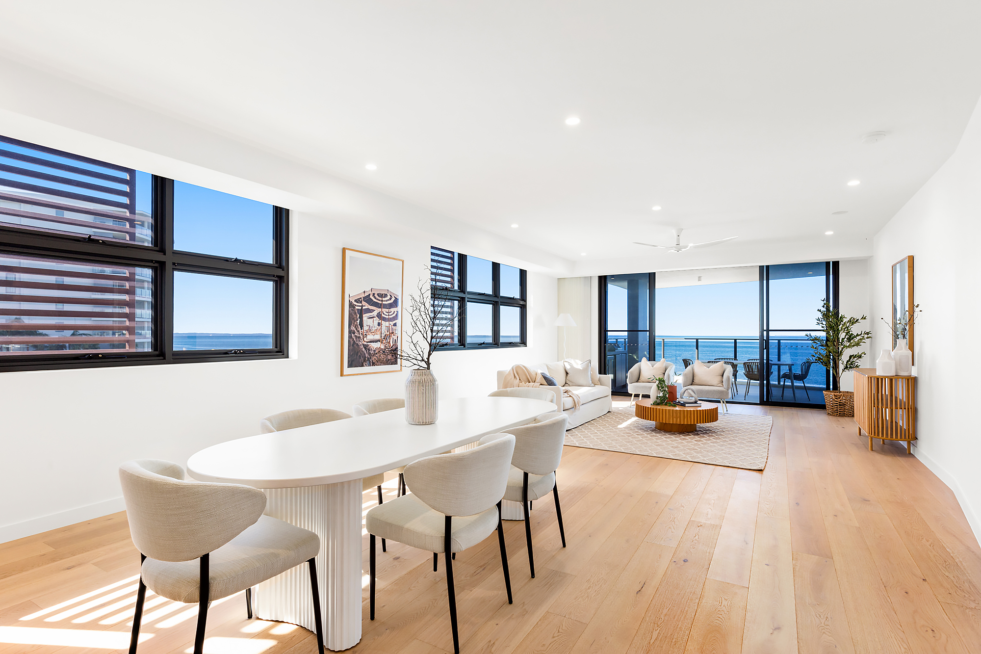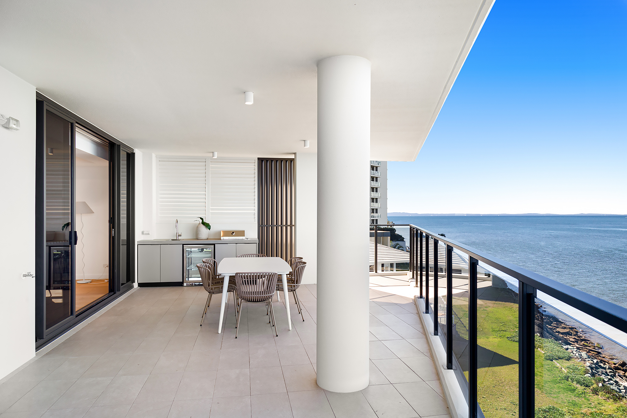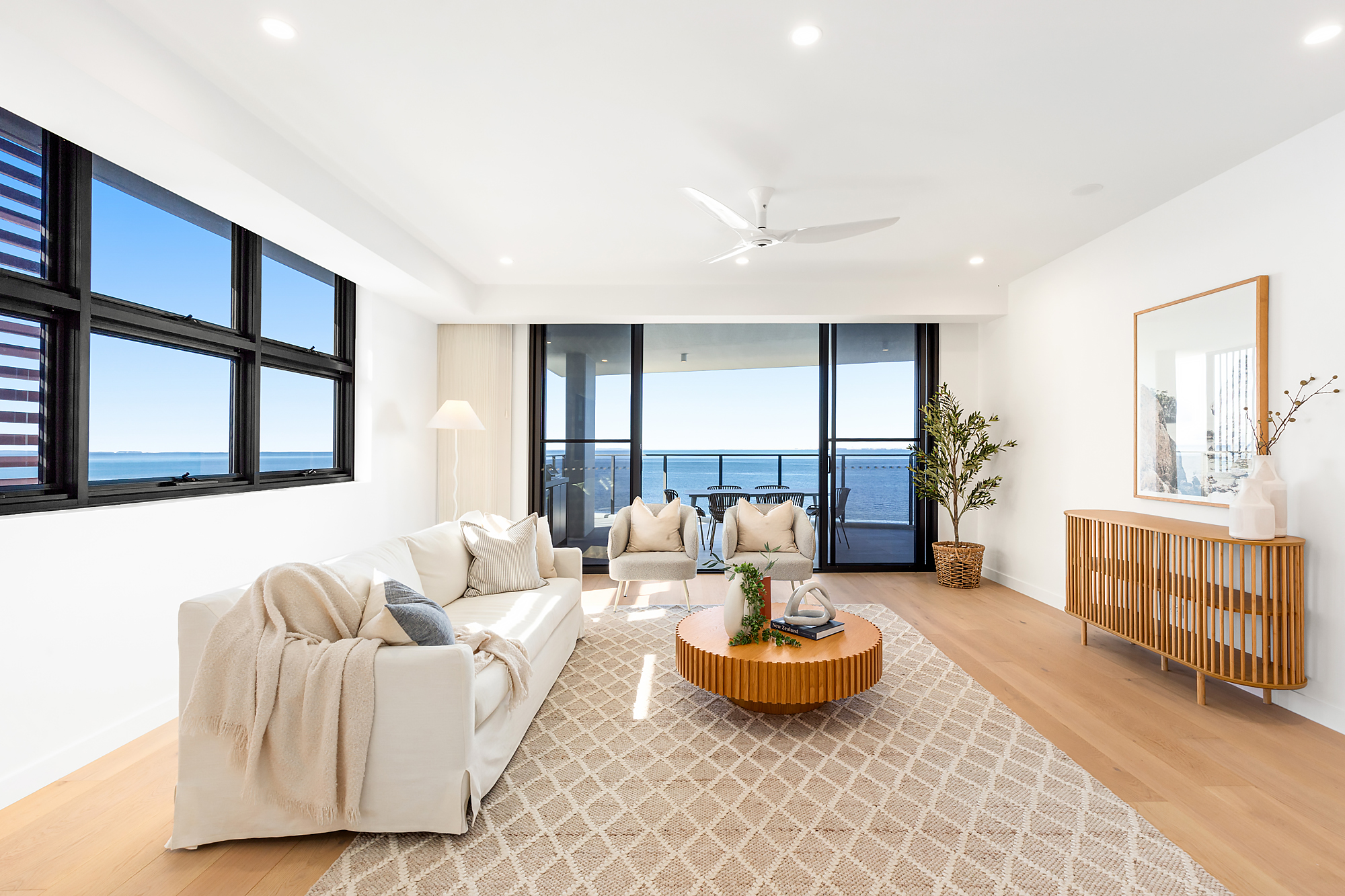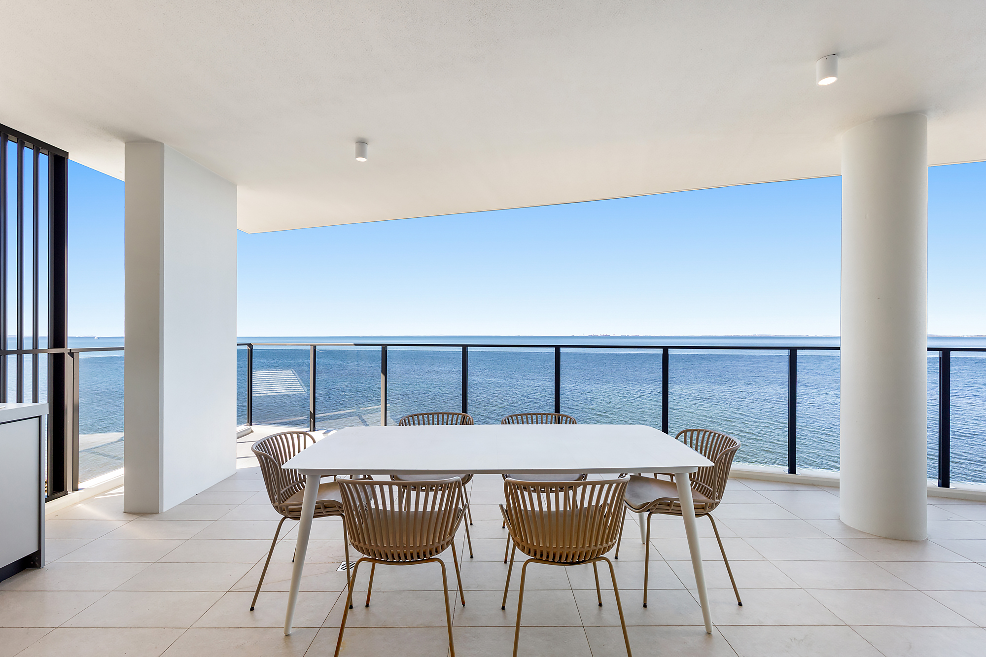 Perfectly positioned on the waterfront in a tightly held boutique complex, this luxurious whole-floor apartment captures uninterrupted views over sparkling Moreton Bay—stretching from Moreton Island across to the Brisbane and Shorncliffe coastline.