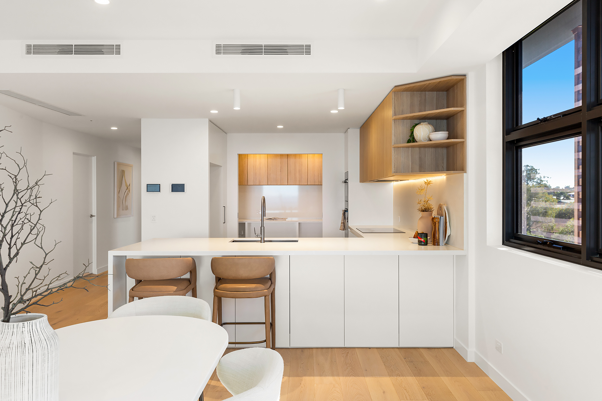 Additional features include ducted air-conditioning with MyAir zoning, motorised blinds, secure double parking, lift access directly into the apartment, and high-end fixtures throughout.