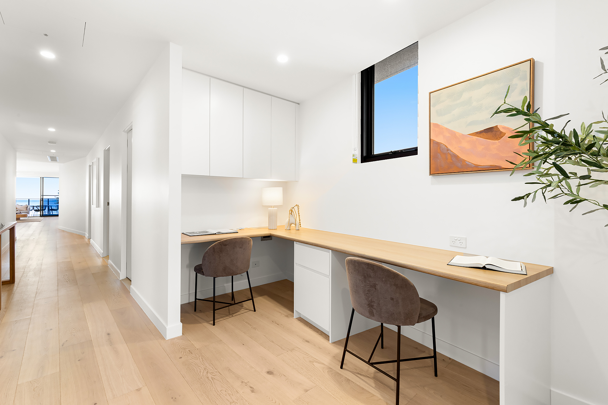 Step outside to a large covered terrace complete with built-in BBQ kitchen and breathtaking views, plus a second private balcony ideal for soaking in sunset skies. The palatial master suite includes ocean views, a custom walk-in robe, and spa-inspired ensuite with freestanding bath. Two additional bedrooms, a second high-end bathroom, a dedicated study, powder room, and large laundry add to the appeal.
