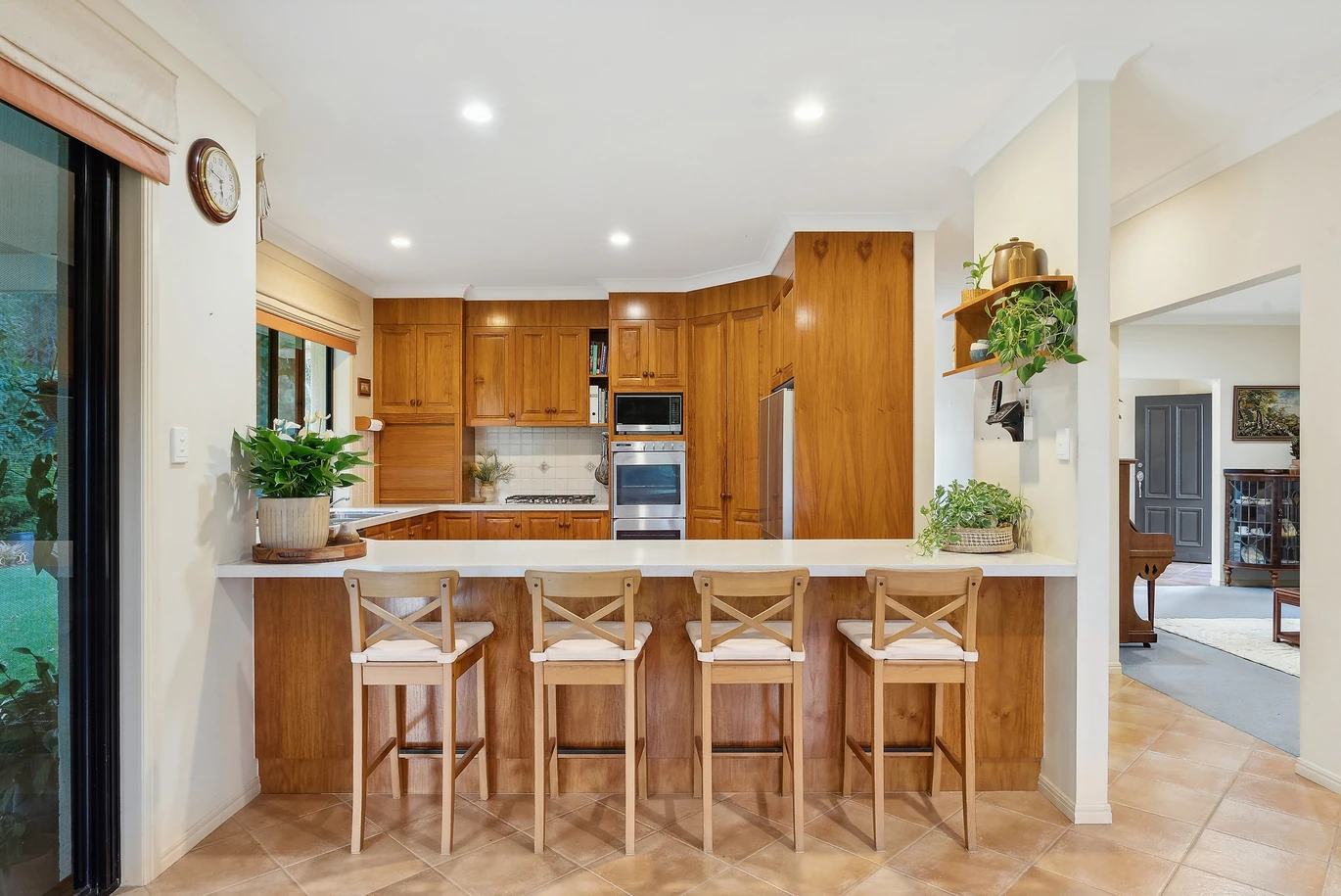 The heart of the home is the expansive open-plan kitchen, living and dining zone - a space designed for togetherness. Bathed in natural light from large windows that frame lush garden outlooks, the kitchen is both functional and welcoming, featuring a gas cooktop, breakfast bar, generous cabinetry and a servery window that opens seamlessly to the outdoor entertaining area. Whether it's busy weekday breakfasts or long weekend lunches with family and friends, this space effortlessly brings people together.