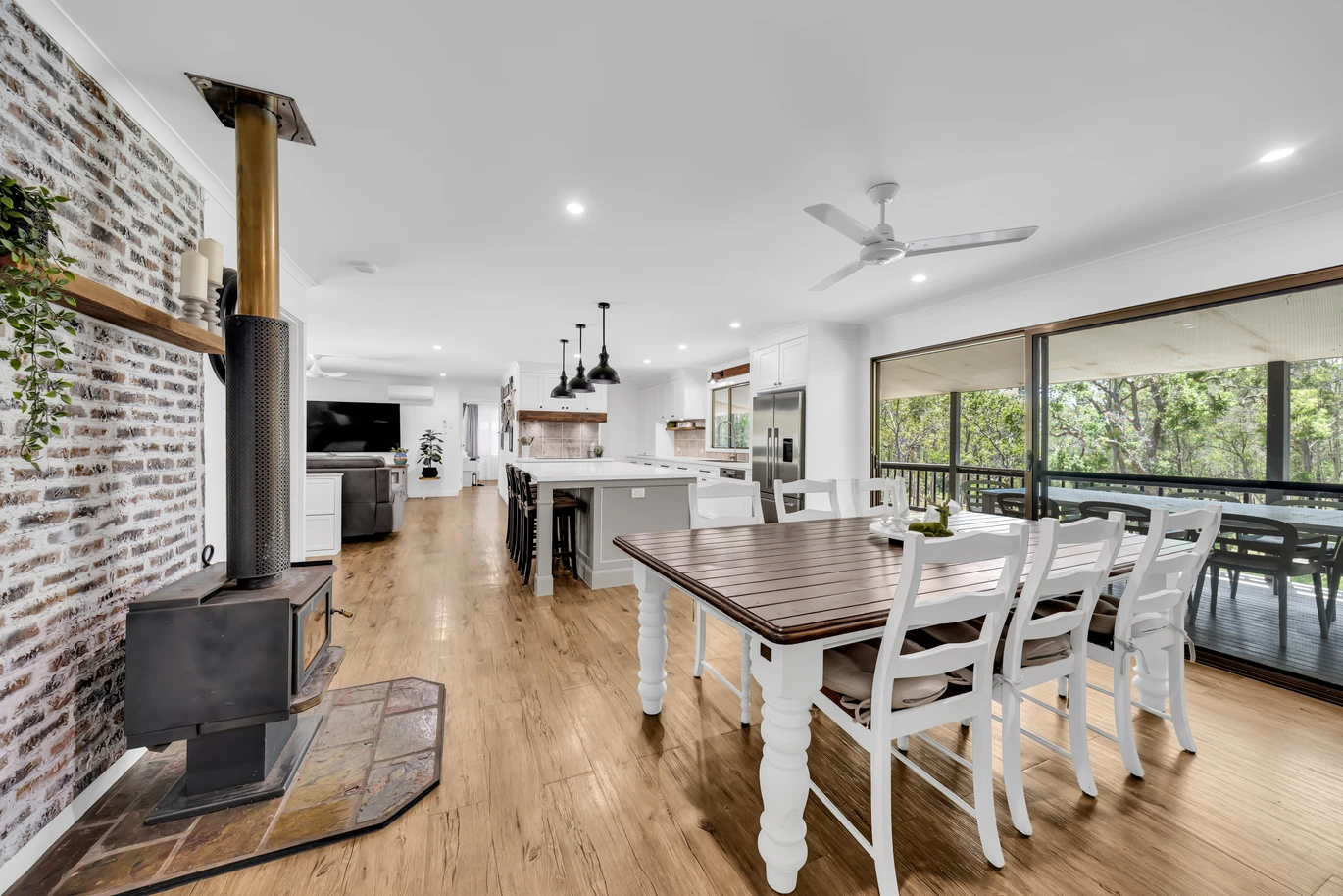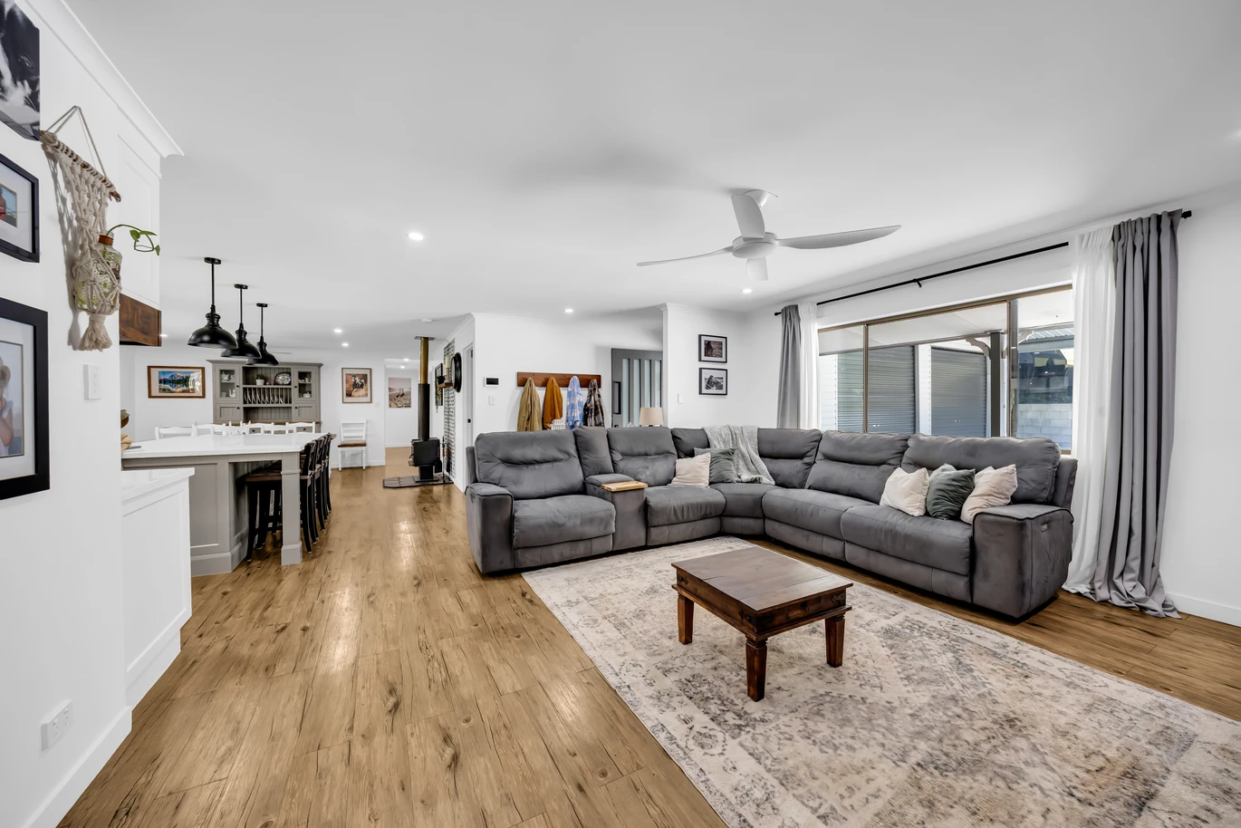 The renovated kitchen anchors the home with serious style - 40mm stone benchtops, induction cooktop, semi-integrated dishwasher, generous walk-in pantry, and sophisticated 2pac profile cabinetry. A large dining and family area flows naturally from the kitchen, while a huge lounge room provides generous family space. The wood heater creates warmth and ambience on cooler winter nights, and split system air conditioning throughout ensures year-round comfort.
