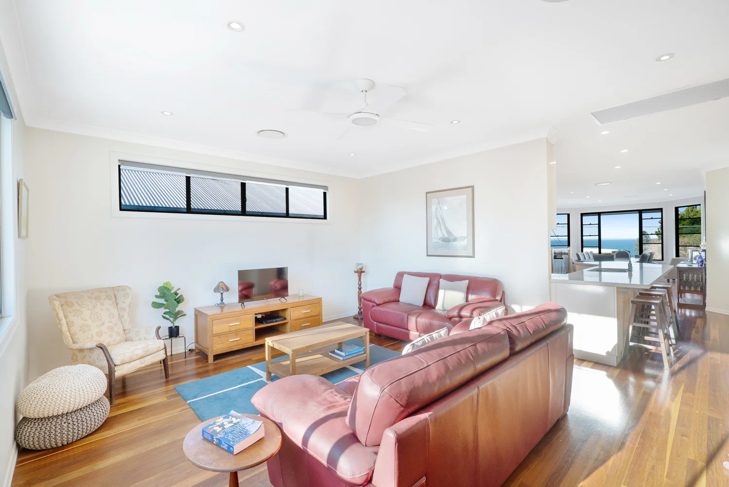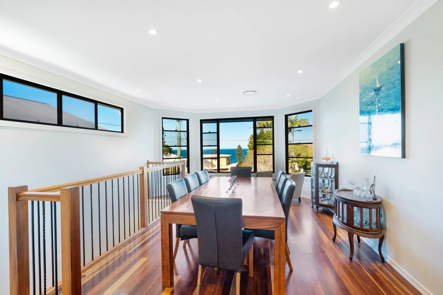 At the front of the home, the main living and dining space is perfectly positioned to take full advantage of these elevated views, framed beautifully by high ceilings and hardwood flooring.