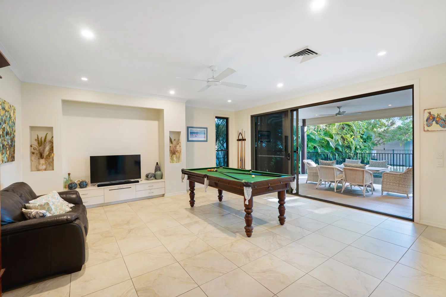Continuing through, the home opens into a spacious games area, which is currently utilised as a billiards room and could easily be used as an additional living space if required. This zone seamlessly connects to the outdoors through expansive triple glass sliding doors, revealing a huge undercover entertaining area. Overlooking a manicured lawn, sparkling swimming pool, and a substantial double bay shed, this outdoor setting is ideal for hosting family and friends year-round.