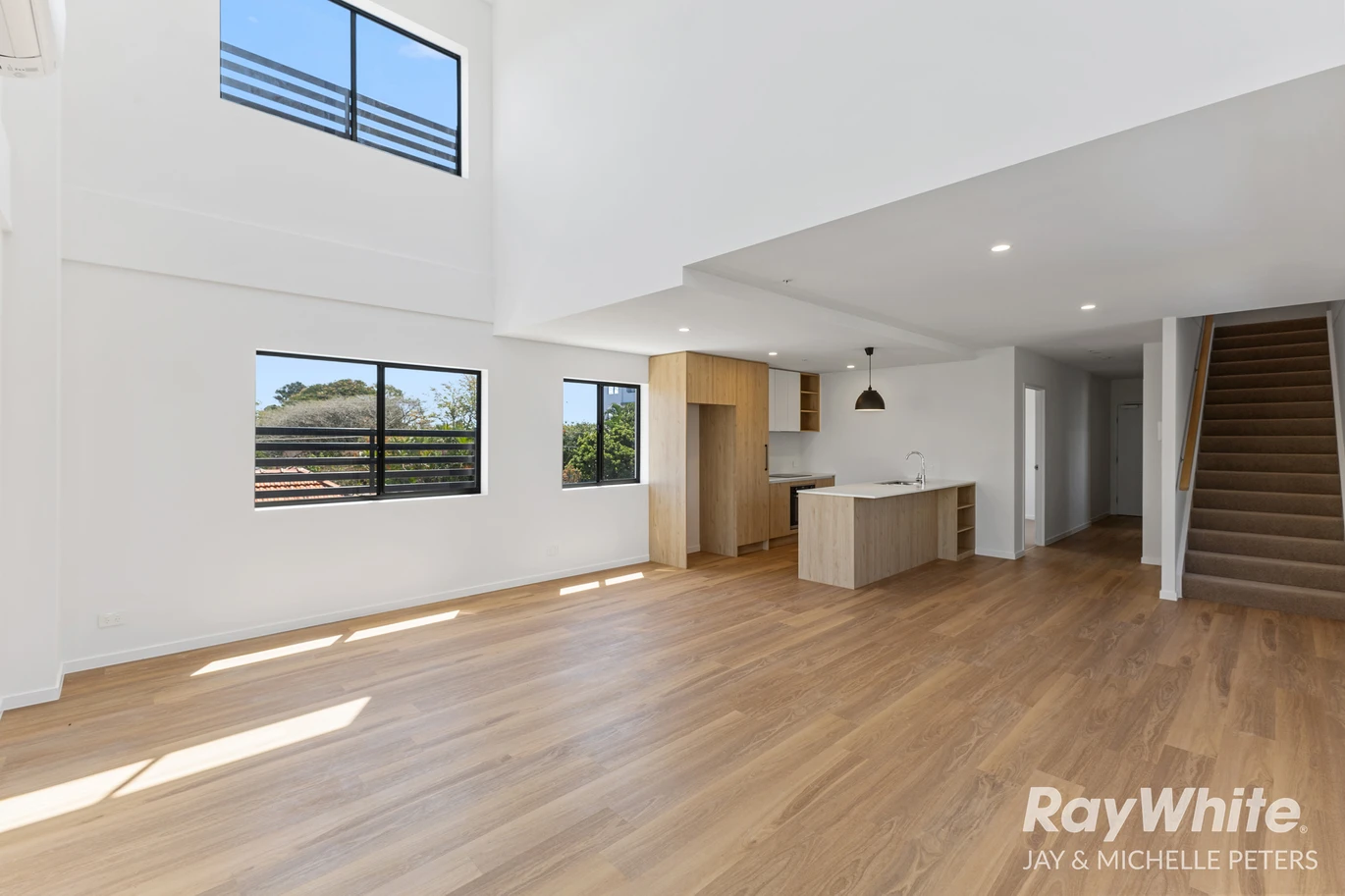 The lower level unfolds beneath a soaring double-height void, bathing the open-plan lounge & dining areas in light & creating a stunning feeling of scale. A gourmet kitchen anchors the design, finished with sleek 20mm stone benchtops, premium Bellissimo appliances & soft timber-look vinyl flooring that brings warmth to the modern palette. Flowing seamlessly outdoors, the generous balcony connects to the living zone - the perfect place to entertain or unwind in the refreshing sea breezes while overlooking the tree-lined street adorned with vibrant poinciana trees.