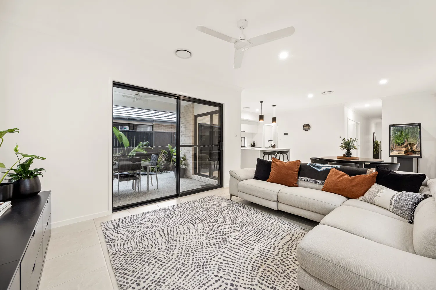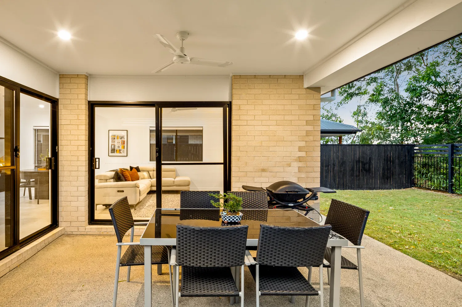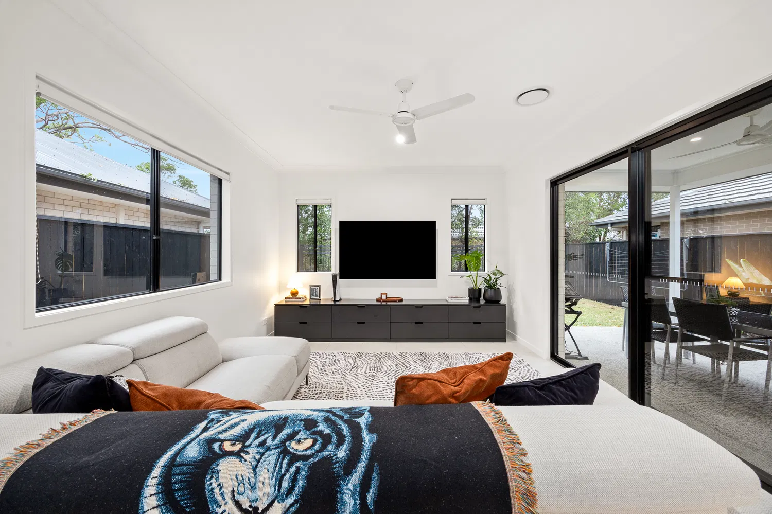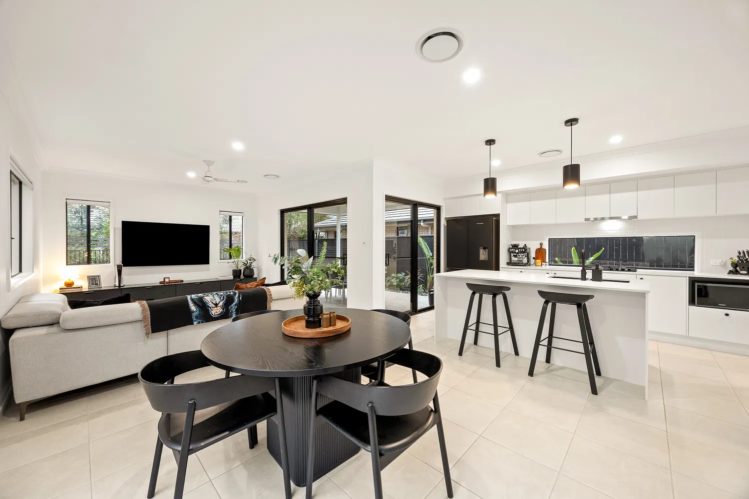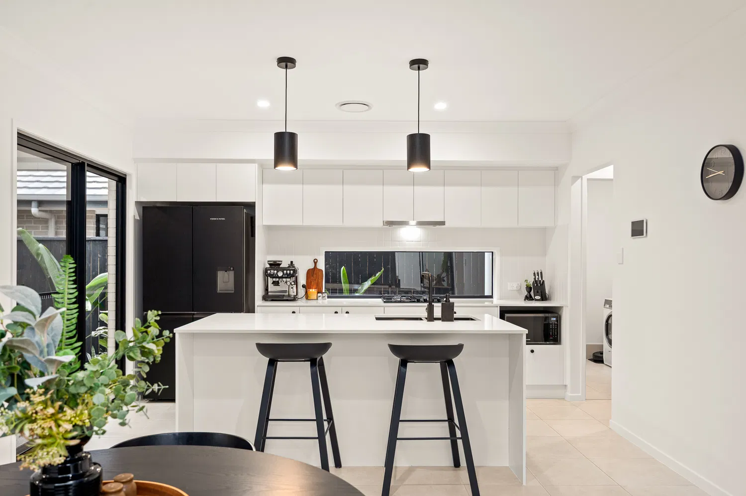 At the heart of the home, the modern kitchen shines with black tapware and appliances, an undermount sink, and a walk-in pantry. The plumbed fridge connection and gas cooking facilities ensure that both daily meals and entertaining are a breeze.