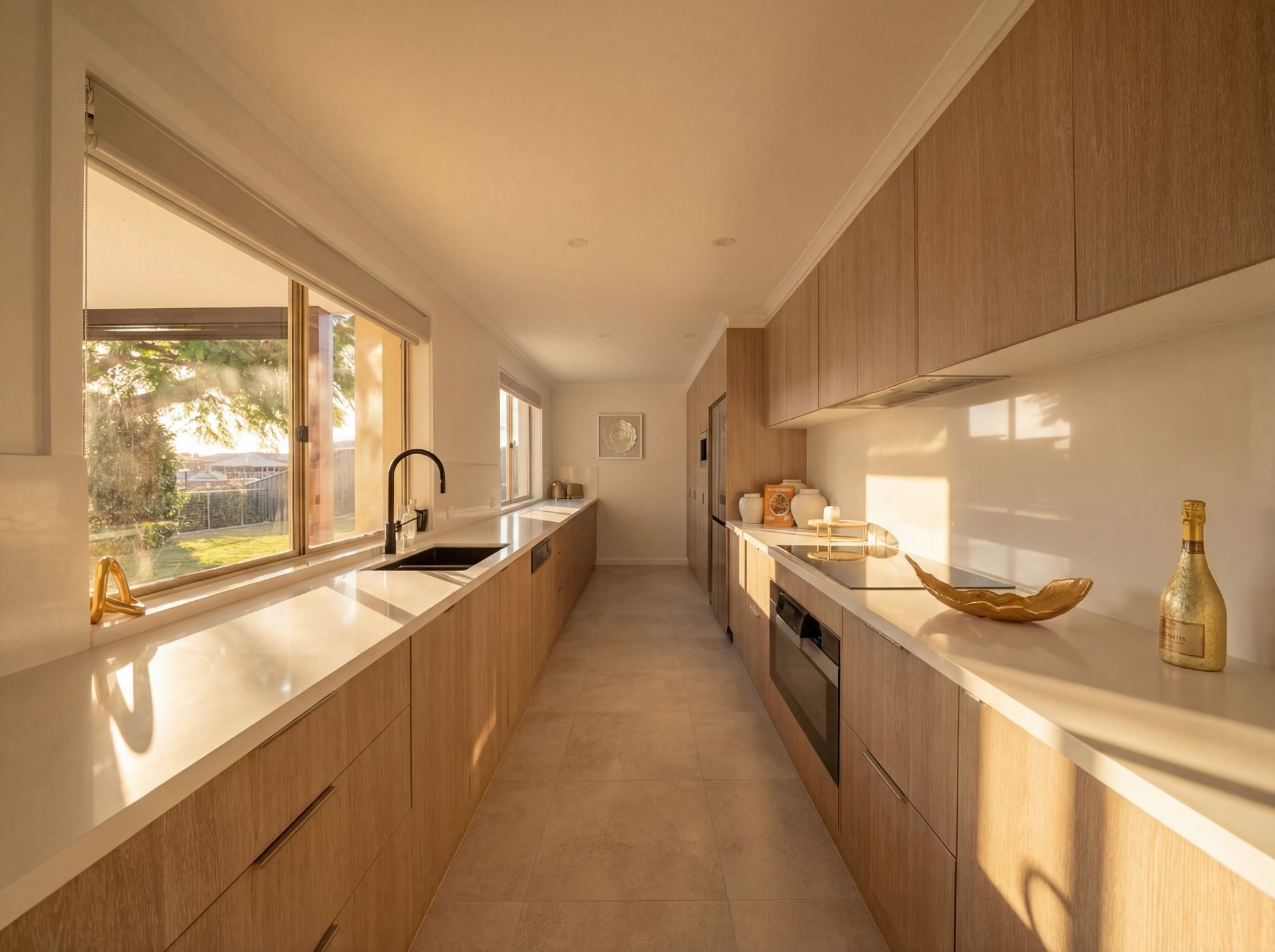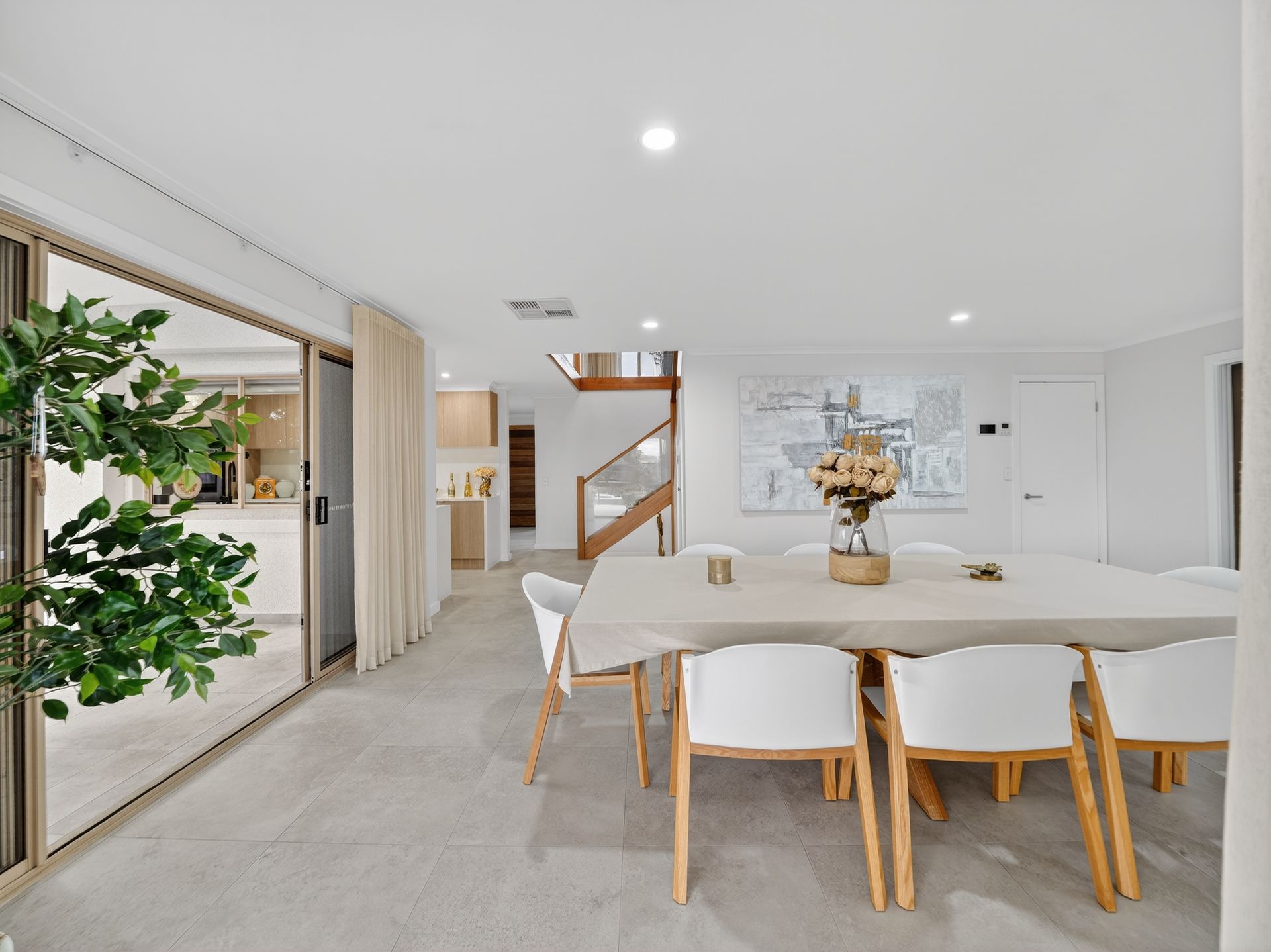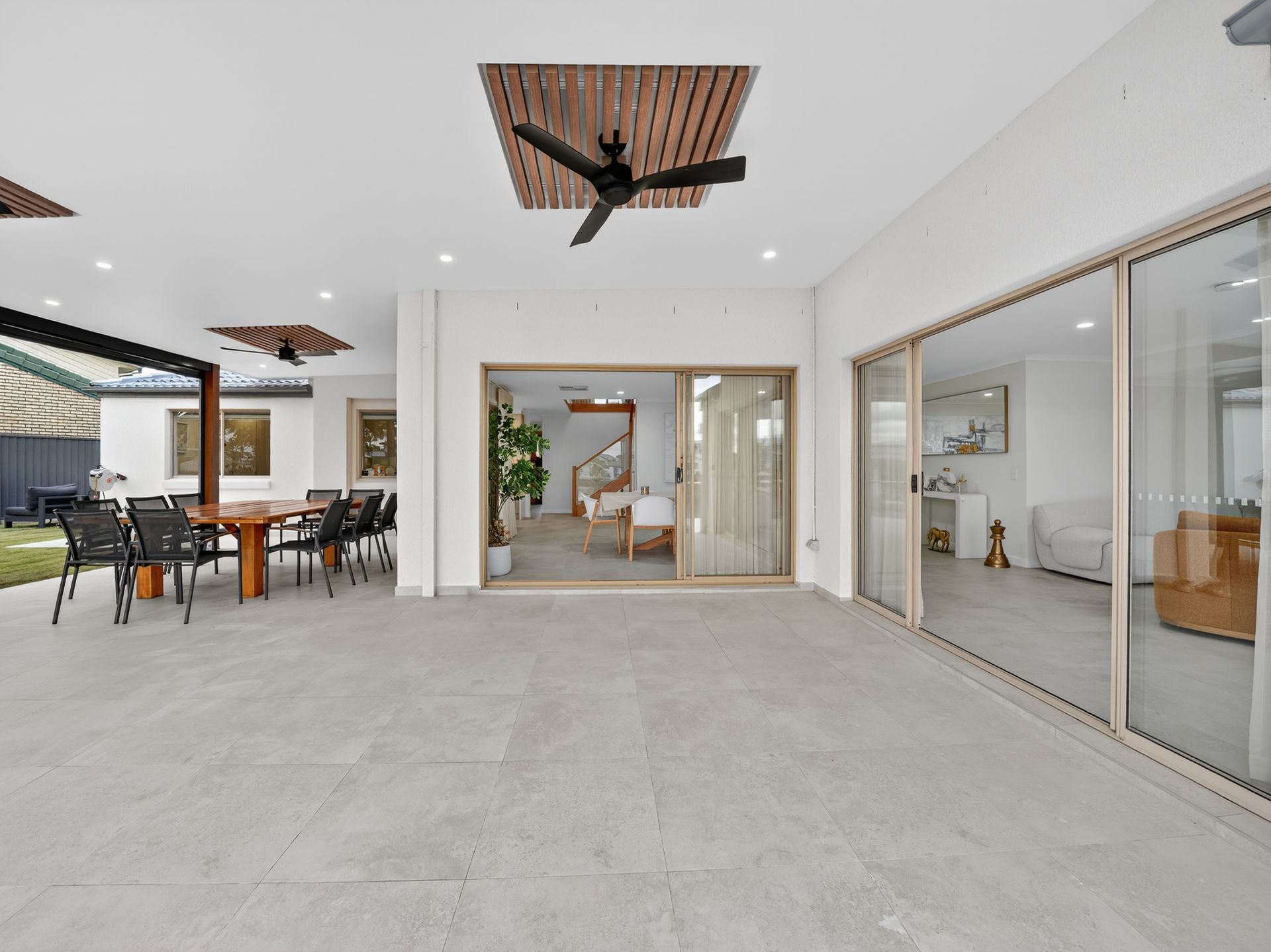 At its heart, the kitchen is designed not just for cooking, but for connection. Appointed with Caesarstone benchtops and a full suite of premium Miele appliances, including a built-in coffee machine, integrated dishwasher, and an expansive full-surface cooktop capable of accommodating up to ten pots and pans - it's a space that effortlessly balances function with indulgence. From here, the home opens naturally into the living and dining zones before spilling out to the covered entertaining area, where three overhead fans and electric blinds create a space to be enjoyed in every season.