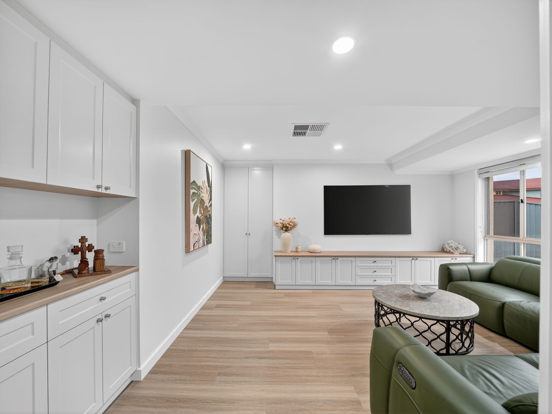 From the moment you arrive, there's an immediate sense of calm. Manicured lawns, framed by lush Sir Grange Zoysia grass, set the tone, while inside, the home reveals a seamless blend of warmth, craftsmanship and modern sophistication. Rich 9mm hybrid flooring flows underfoot, while Australian-made custom joinery brings a level of detail and quality that is both timeless and deeply considered.