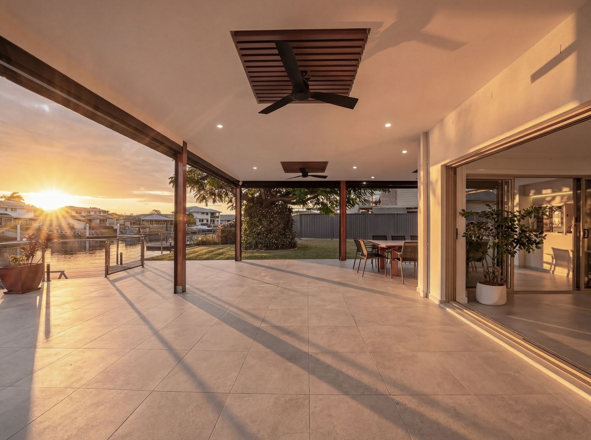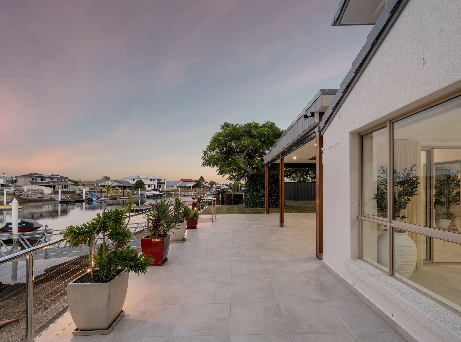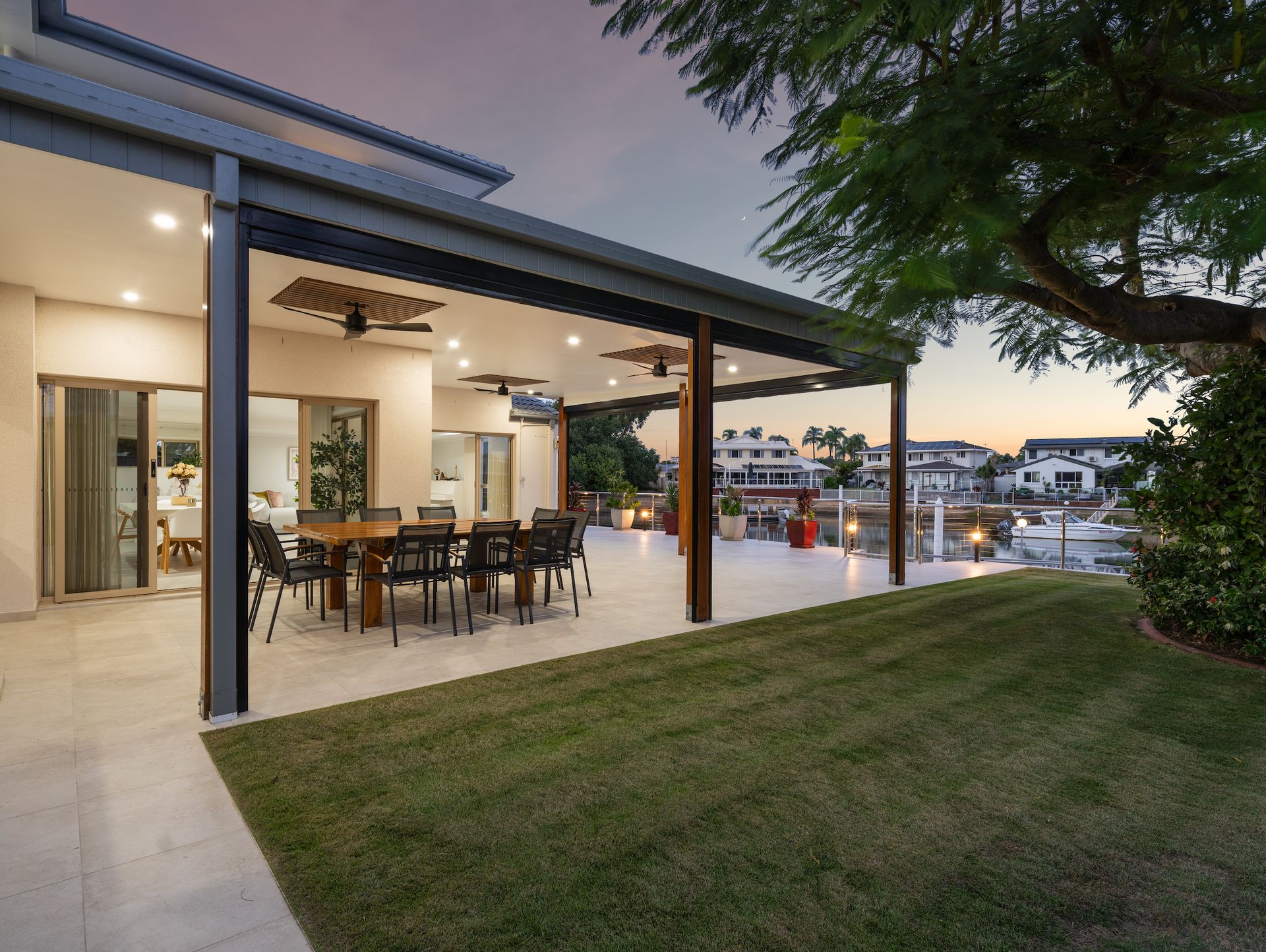 Beyond, the backyard invites a slower pace. A striking poinciana tree stands as a natural centrepiece, casting dappled light across the lawn, while the water beyond glows in the afternoon as stunning sunsets settle over the canal. Whether it's long lunches, evening drinks, or simply unwinding by the water, this is a home designed to be lived in and enjoyed. The oversized pontoon offers direct access to the waterways, reinforcing the effortless coastal lifestyle that defines Newport living.