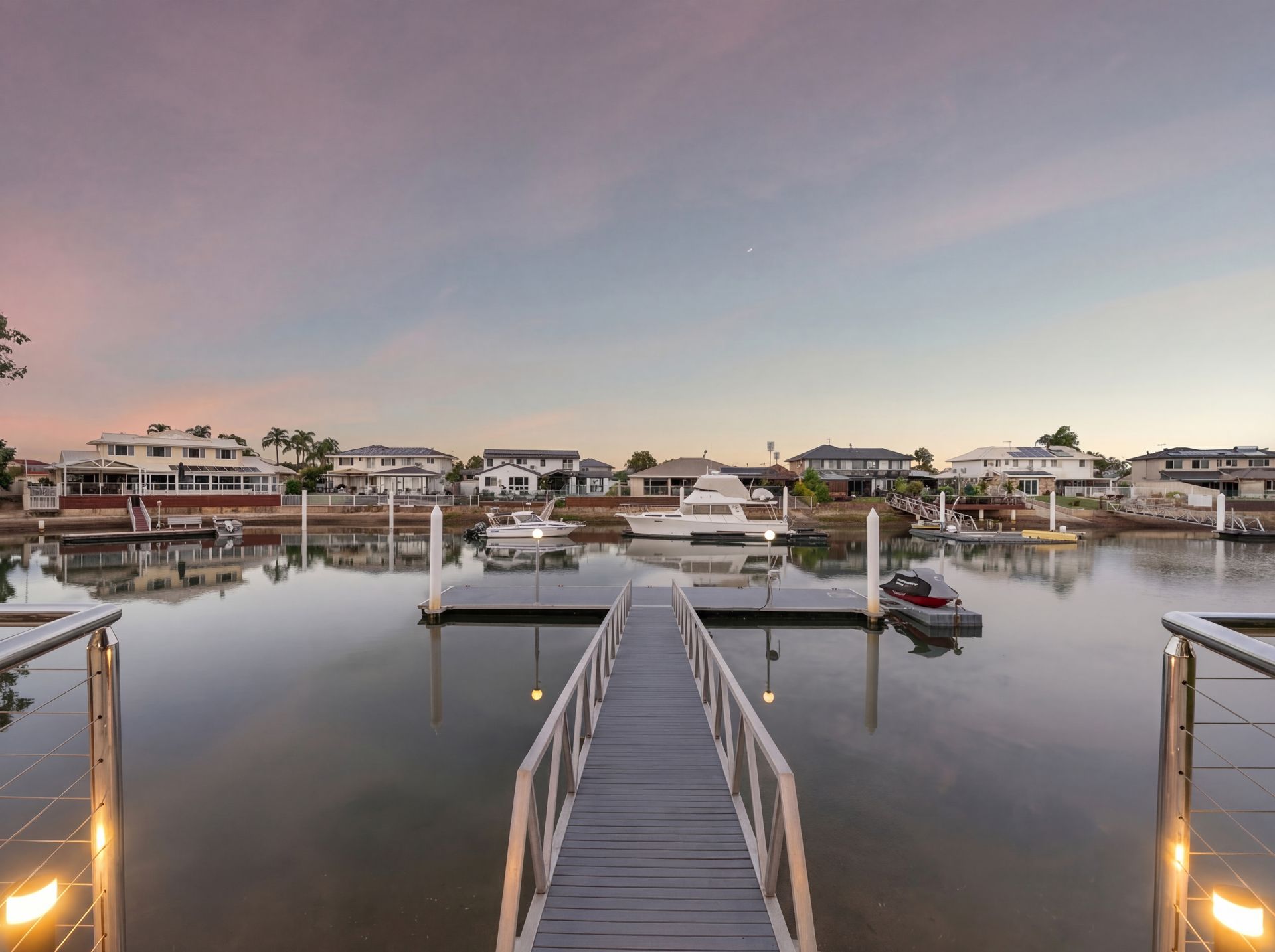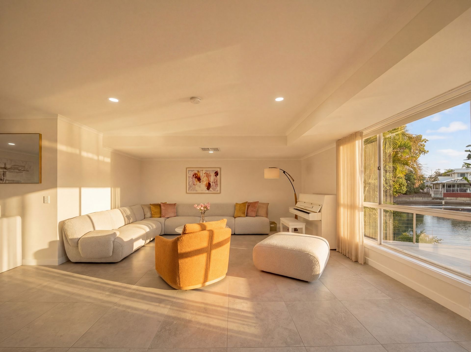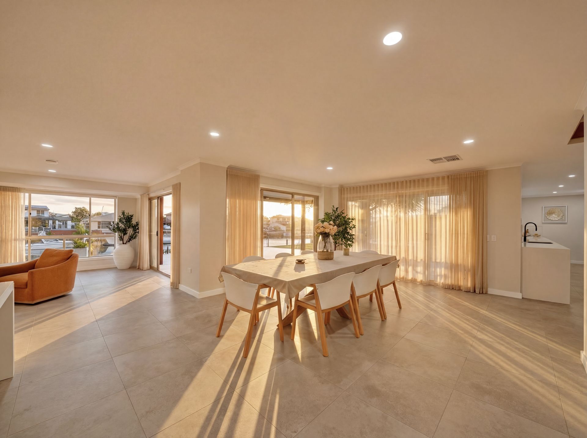 Beyond, the backyard invites a slower pace. A striking poinciana tree stands as a natural centrepiece, casting dappled light across the lawn, while the water beyond glows in the afternoon as stunning sunsets settle over the canal. Whether it's long lunches, evening drinks, or simply unwinding by the water, this is a home designed to be lived in and enjoyed. The oversized pontoon offers direct access to the waterways, reinforcing the effortless coastal lifestyle that defines Newport living.