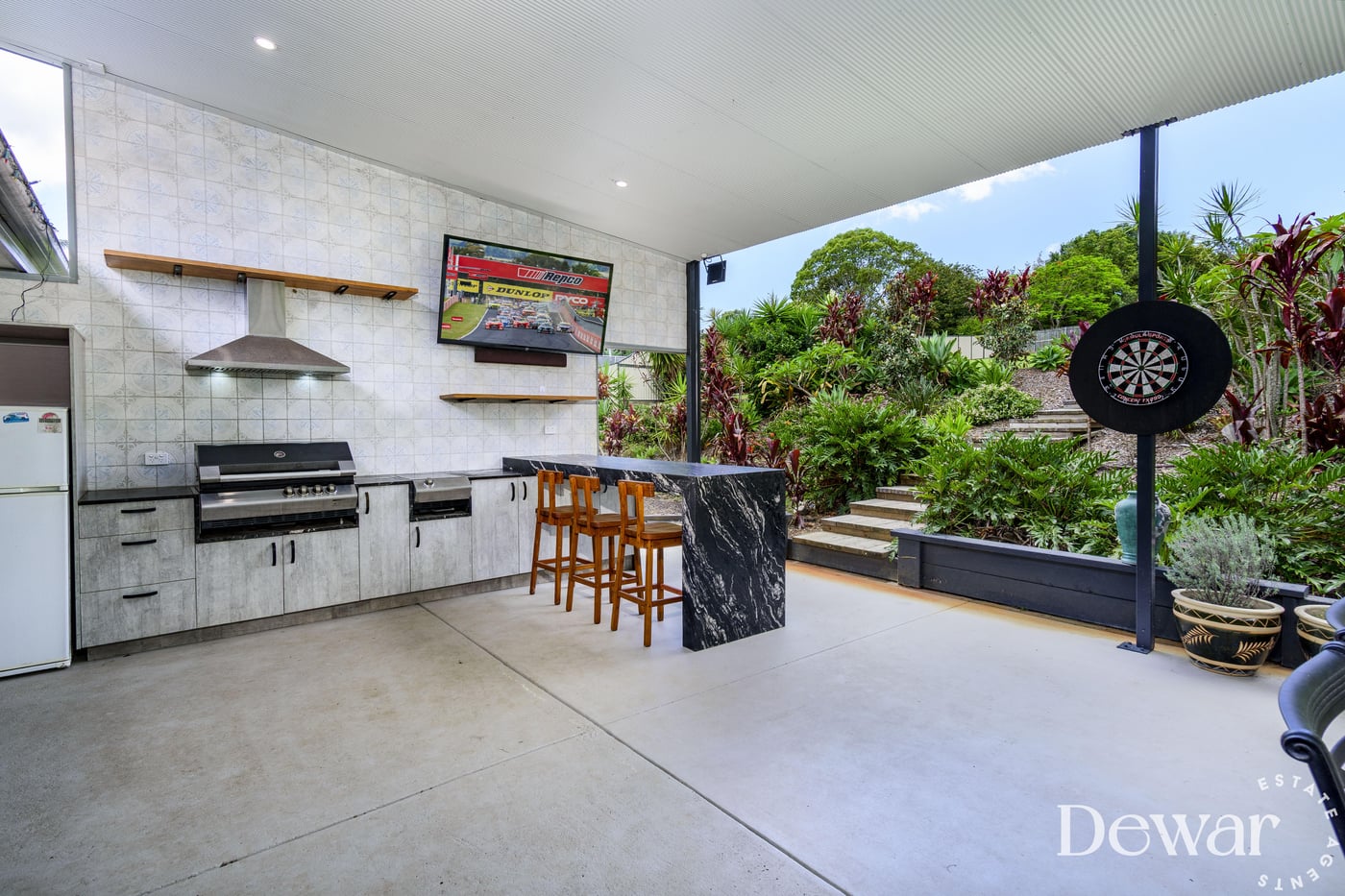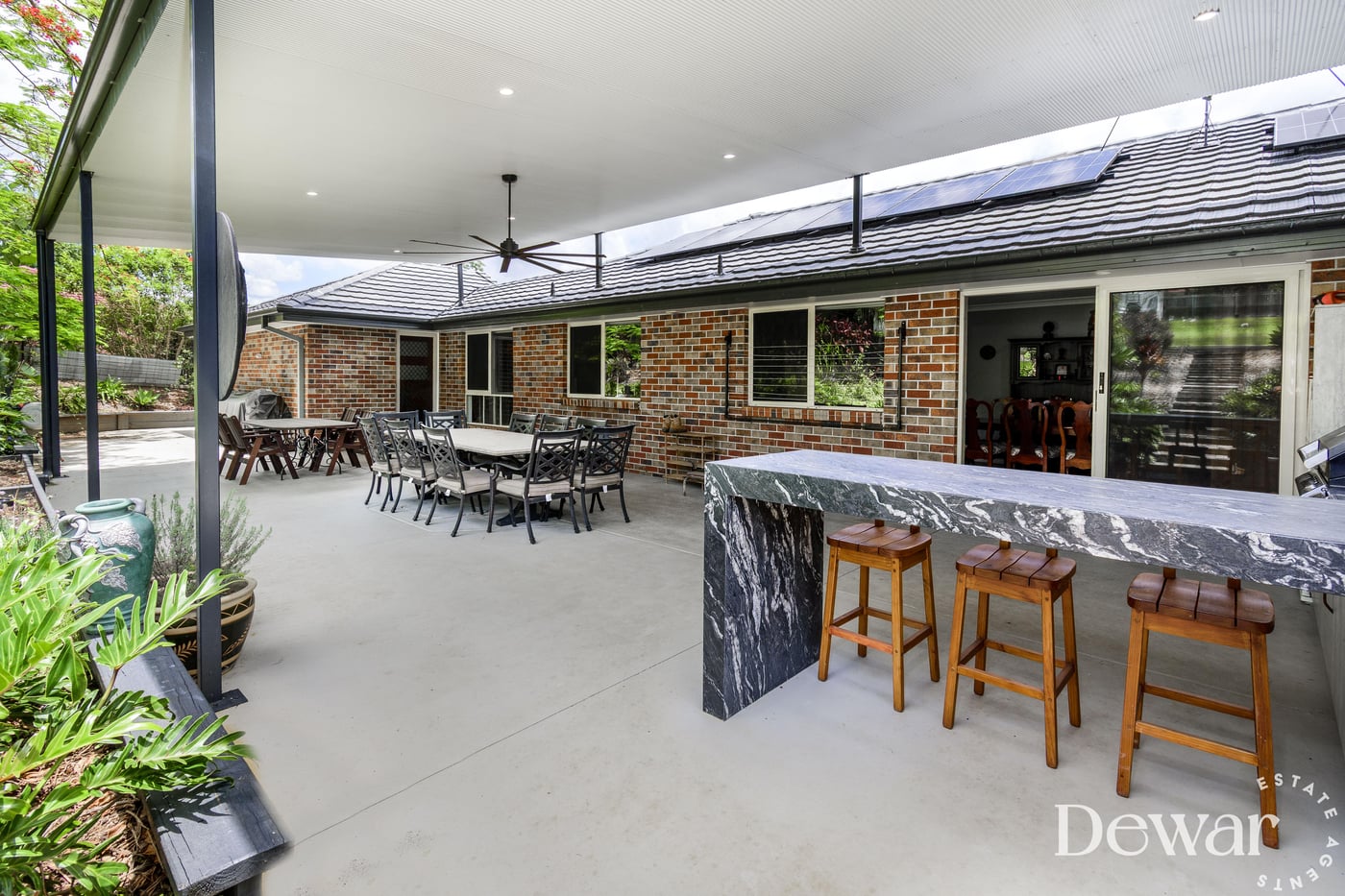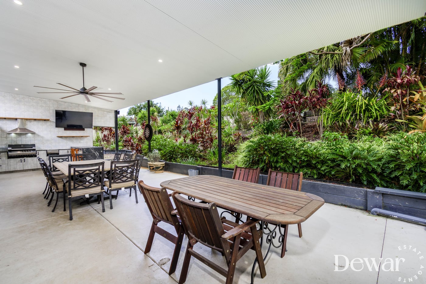 Walk outside and prepare to be absolutely blown away. This is outdoor entertaining – redefined. The oversized enormous flyover patio is an entertainer's dream – featuring a built-in granite bar and outdoor kitchen, LED lighting, a huge plantation fan to keep the summer breeze flowing, and views over the elevated, meticulously manicured tropical gardens.