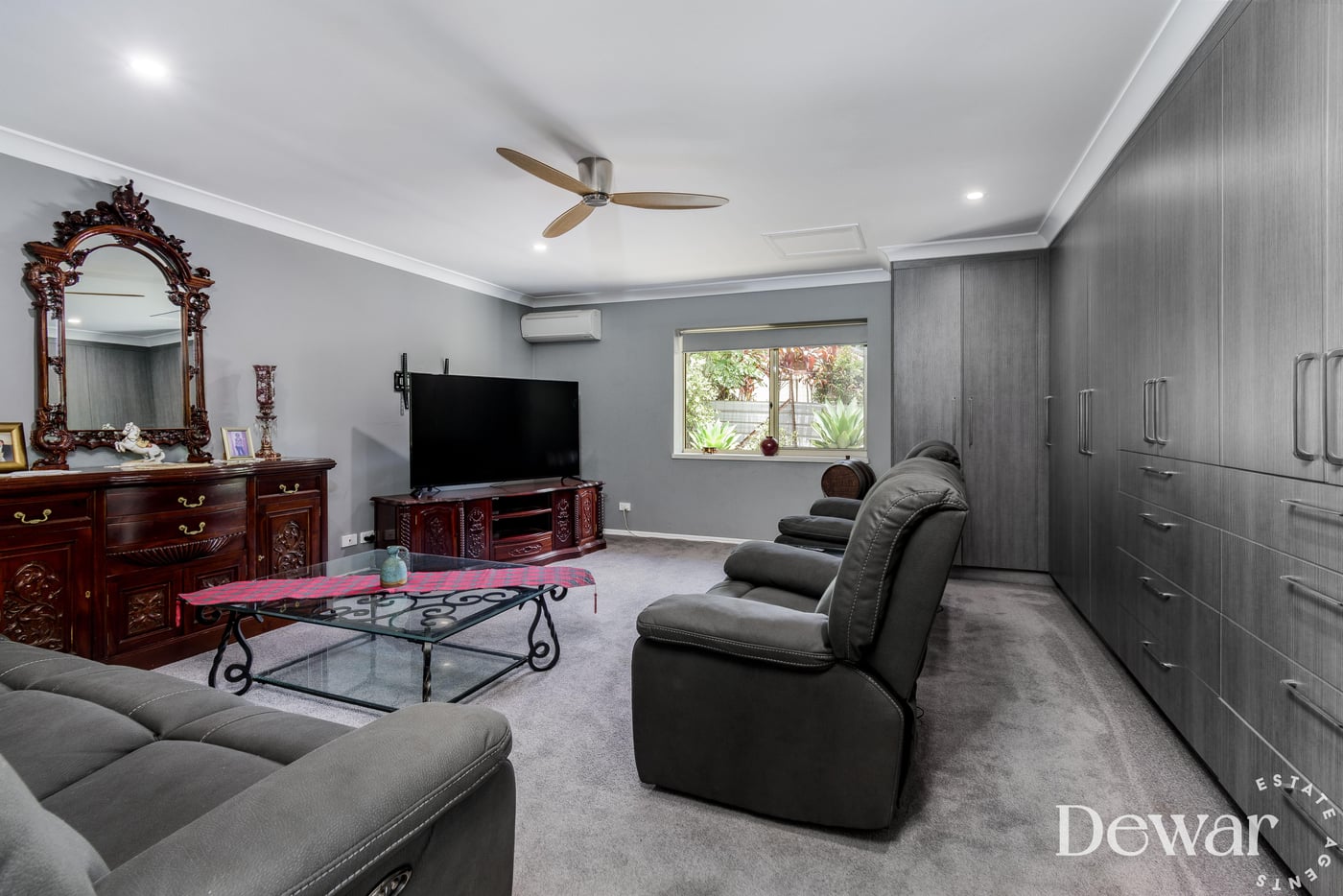 • Master bedroom with split-system A/C, ensuite featuring stone benchtops & double shower – Ceiling fan and mirrored built in robes