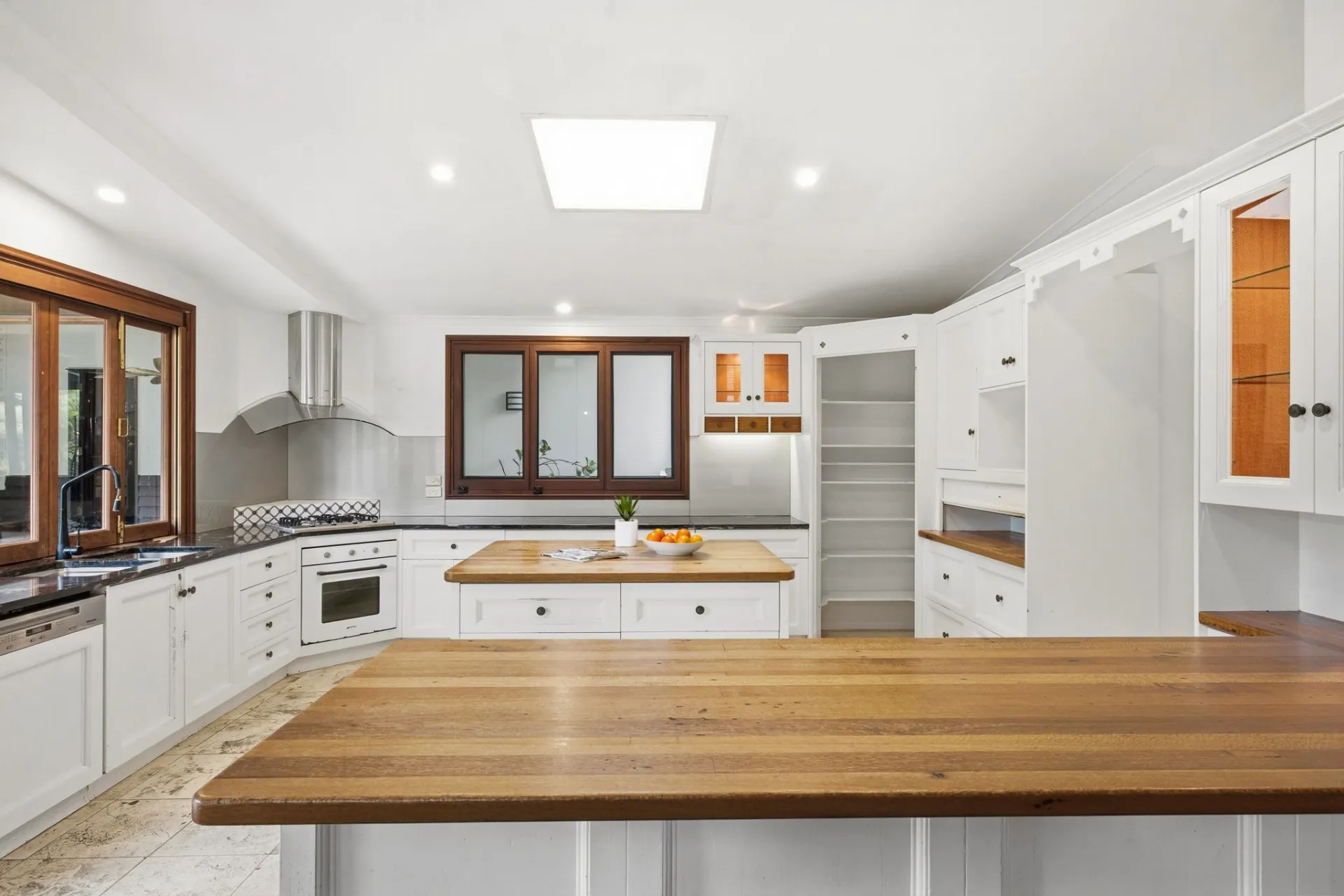 Inside, the main living hub is warm and inviting, with timber flooring, expansive glazing and seamless access to outdoor entertaining. The kitchen is generous in scale, featuring a central island, extensive storage and natural light from above-positioned perfectly to connect with both indoor and outdoor living zones.