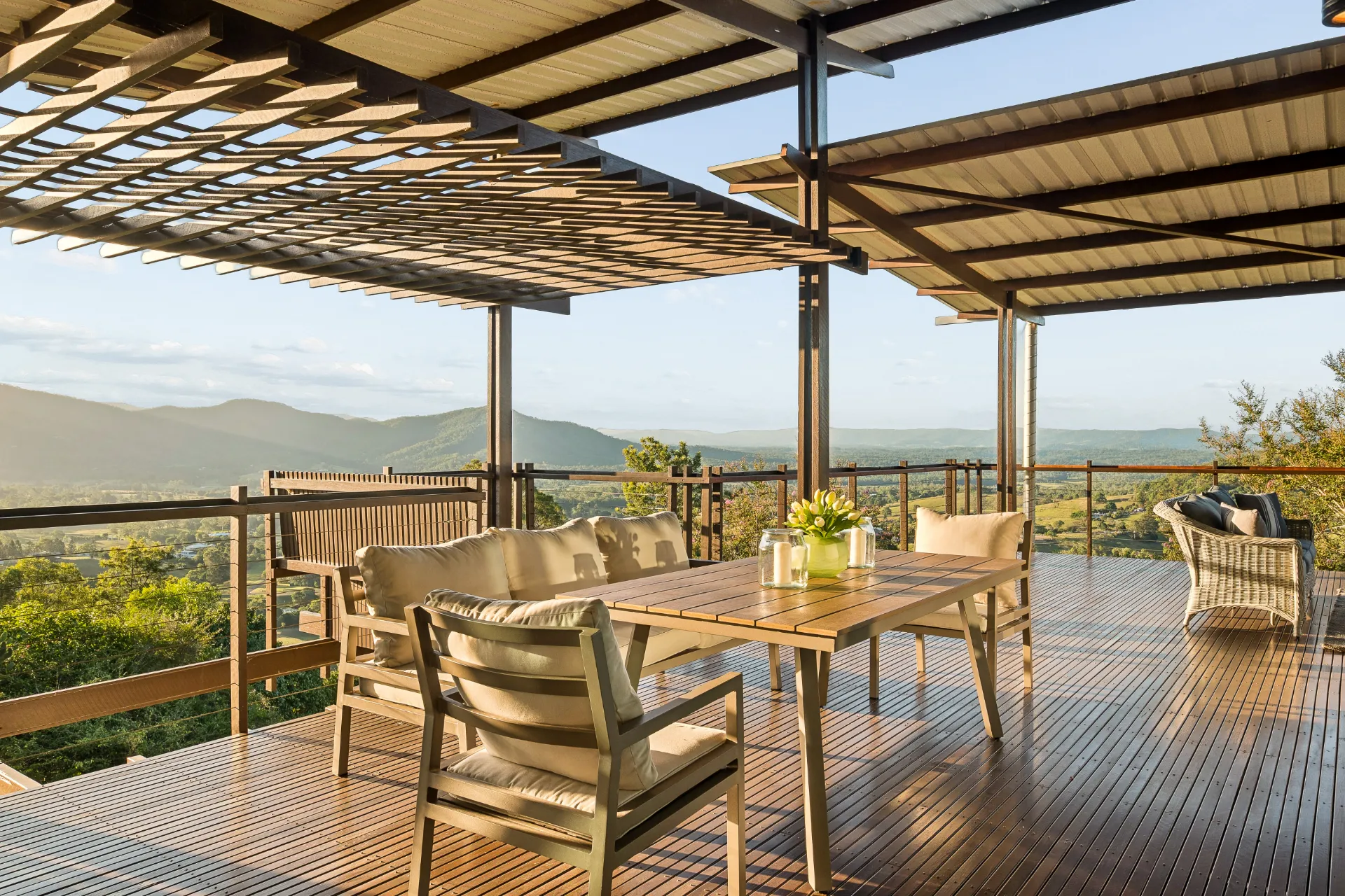 The main living and dining zones are open, light-filled and generous in scale, flowing seamlessly to expansive decks and covered alfresco areas perfect for entertaining or quiet moments overlooking the landscape. The kitchen is equally well considered, featuring a large five-burner gas cooktop and a substantial custom-made benchtop inlaid with colourful stones-a refined centrepiece that brings both craftsmanship and character to the heart of the home. Custom-made blinds have been thoughtfully integrated to soften the sun while still preserving the views and connection to the outdoors.