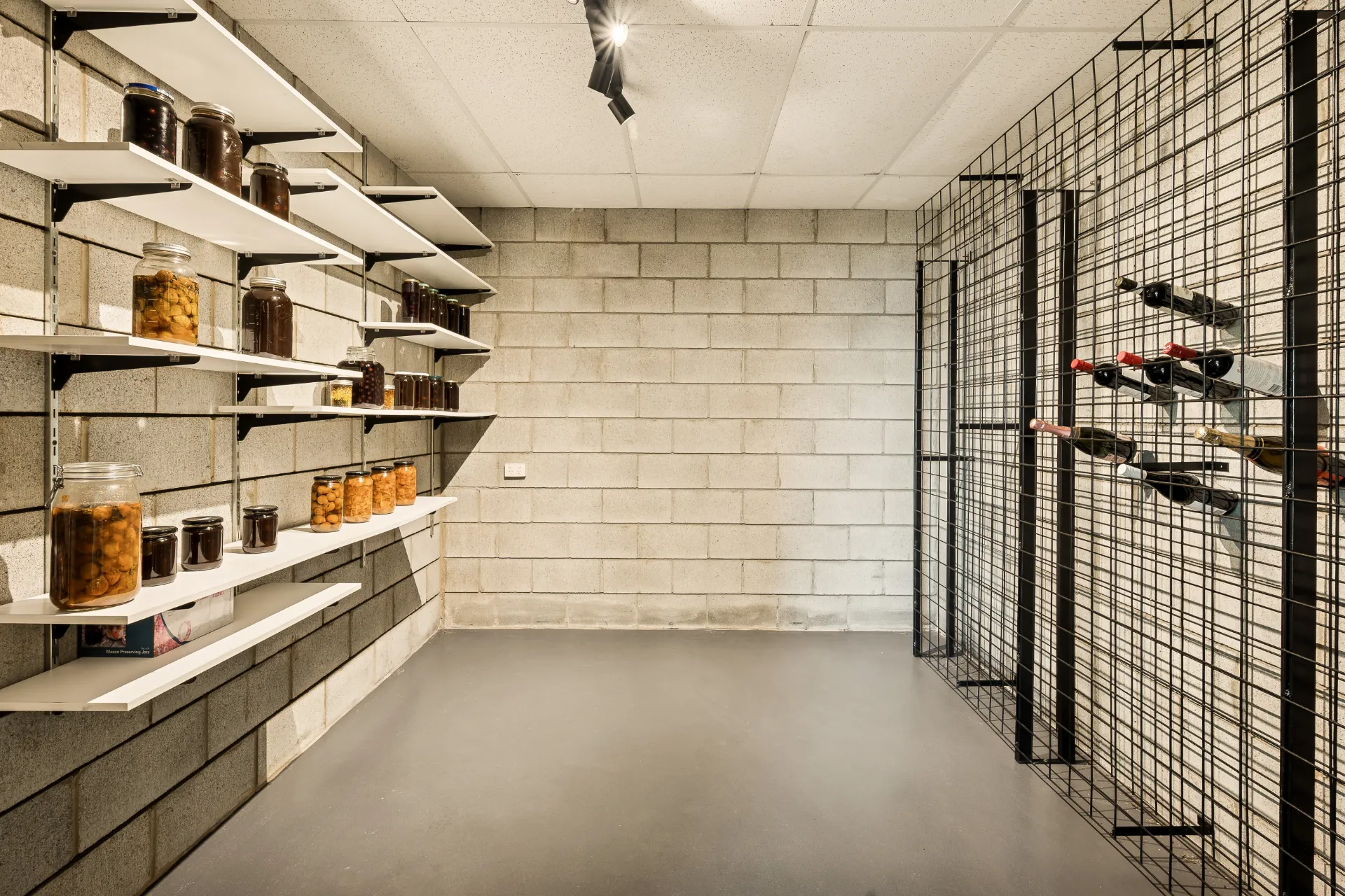 The master suite is thoughtfully set apart to capture elevated mountain and valley views, complemented by a walk-in robe, a built-in study area, a split air-conditioning unit, and a contemporary ensuite with a double stone vanity. On the lower level, a generous wine cellar offers excellent storage capacity, with dedicated racking and shelving that make entertaining and collecting effortless. A large lockable storage room further adds secure, practical space for everyday and seasonal items.