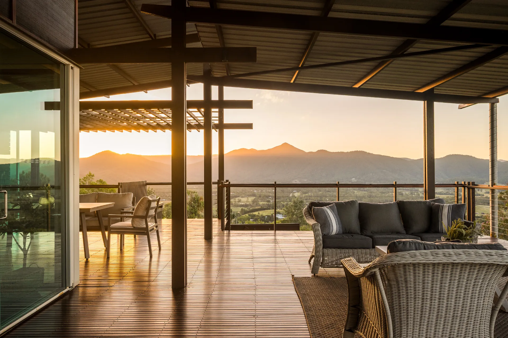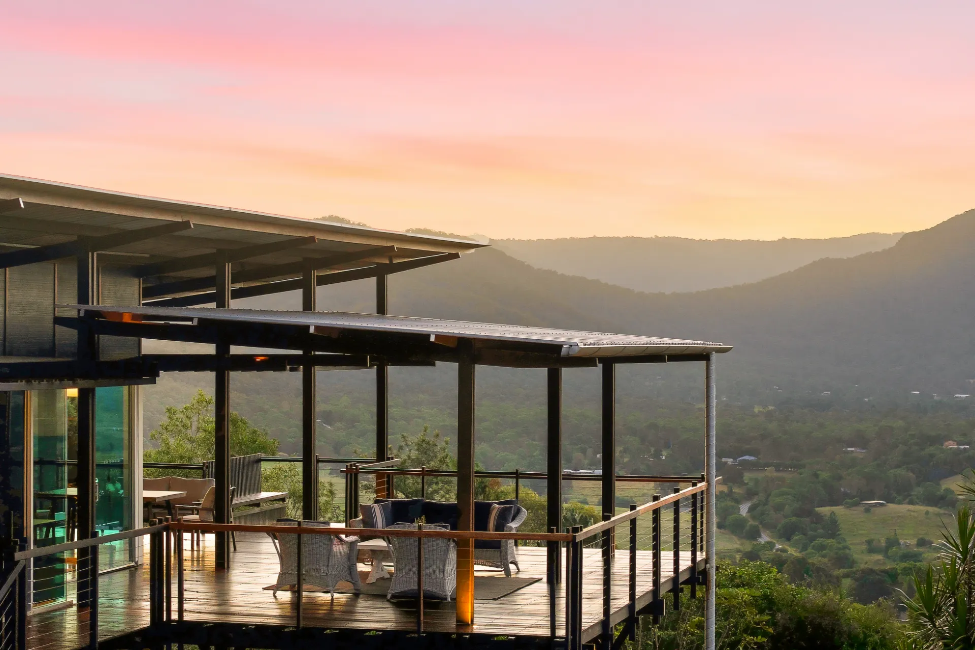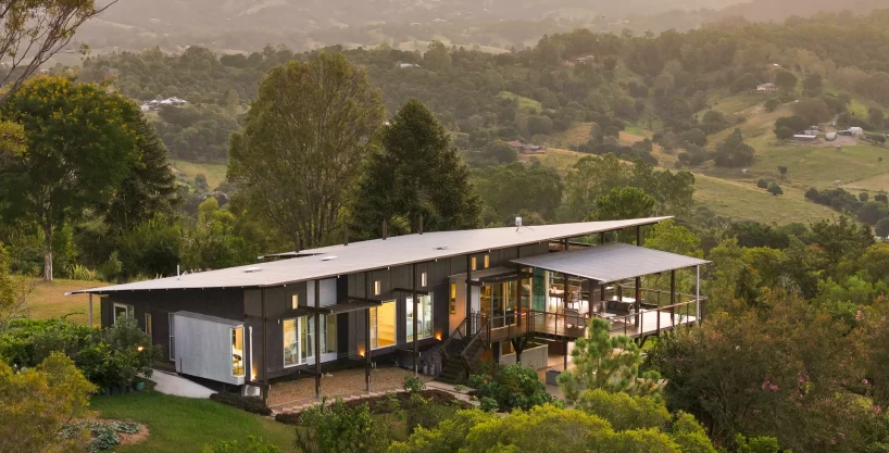 Set high across 9.35 hectares of gently undulating Mount Samson countryside, this architecturally designed residence offers a considered balance of modern rural living, environmental intelligence and expansive valley outlooks. Privately positioned at the end of a quiet cul-de-sac, the home enjoys a peaceful hilltop setting with sweeping views across rolling green hills and surrounding valleys.