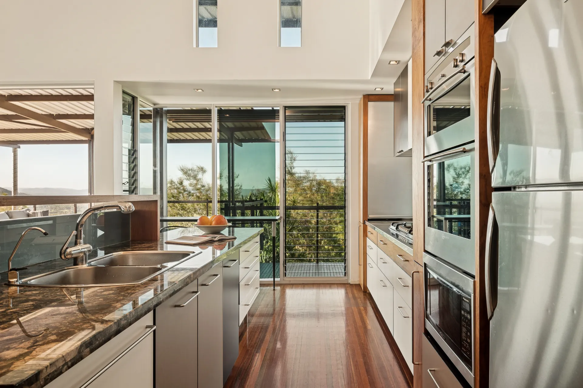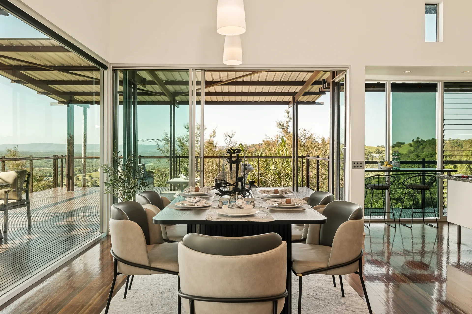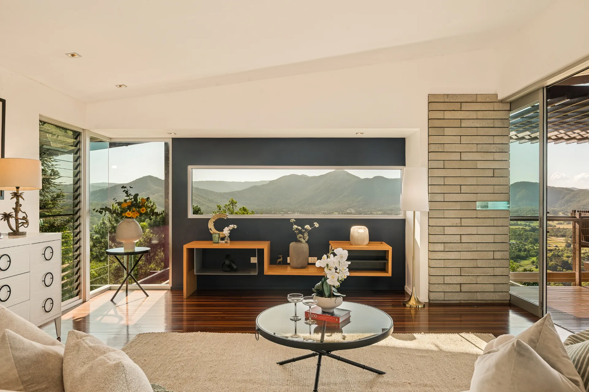 A gated entrance with a long, tree-lined bitumen driveway creates a sense of arrival, leading to a home designed to sit in harmony with its environment. Upon entering, a carefully detailed feature wall immediately greets you with its incorporation of numerous glass elements-an understated layer of texture and interest that reads like a curated piece of artwork. Framed windows capture the outlook from throughout the home, drawing the landscape into everyday living. Inside, soaring ceilings, polished hardwood floors, and extensive use of glass and louvres invite natural light and cooling breezes, enhancing the home's calm, breathable feel.