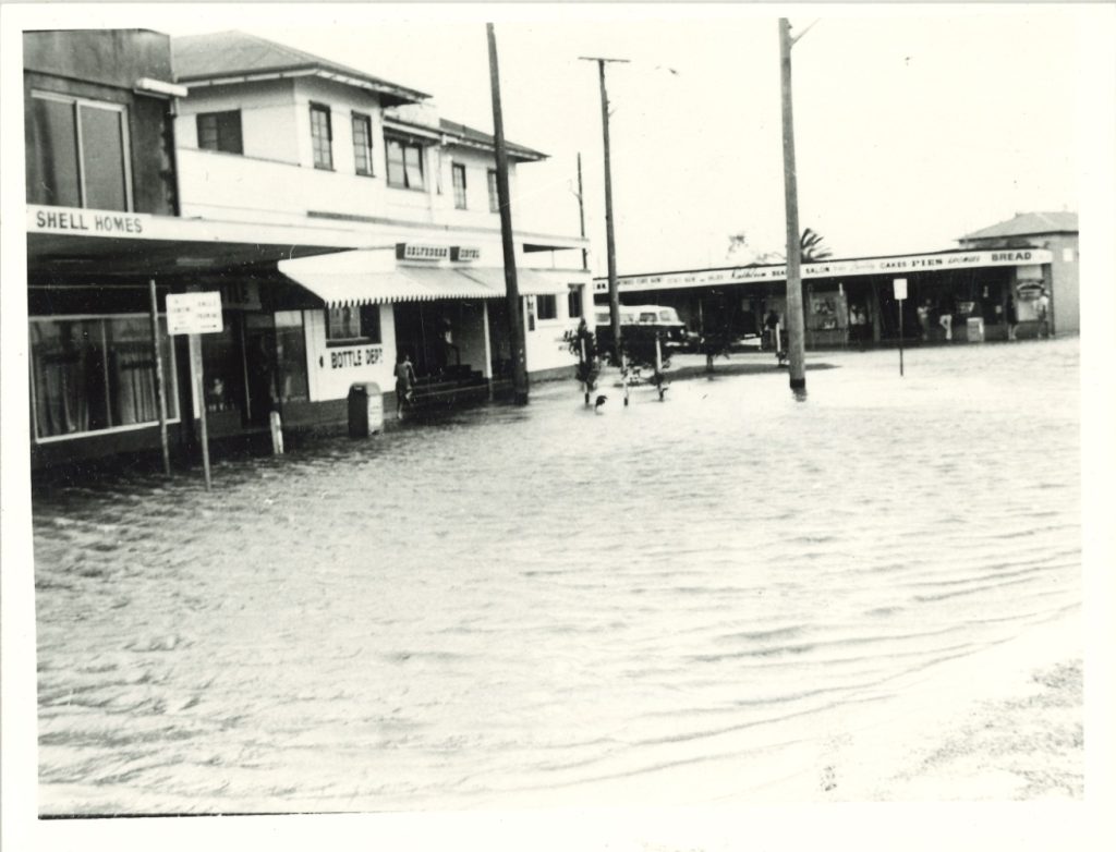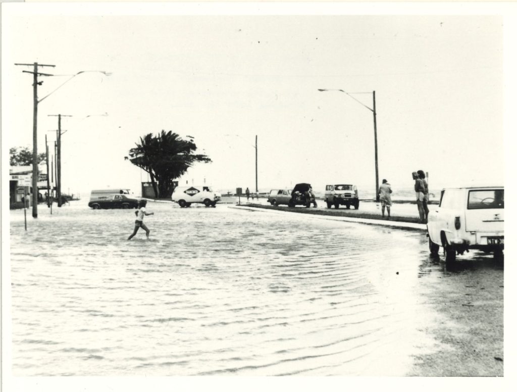 Flood waters during the 1974 cyclone, when king tides prevented rain water flowing into the drains. First photograph taken at the corner of Woodcliffe Crescent and Oxley Avenue (where Belvedere Hotel is) and the second photograph taken at the end of Oxley Avenue. Photo credit: SLQ collection
