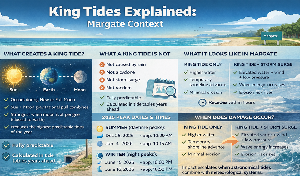 If you’ve stood along Margate’s foreshore during a king tide, you’ve seen the water sit higher than usual. Sand narrows. Park edges saturate. Photos circulate with the same quiet question: is this temporary — or is it something more permanent?